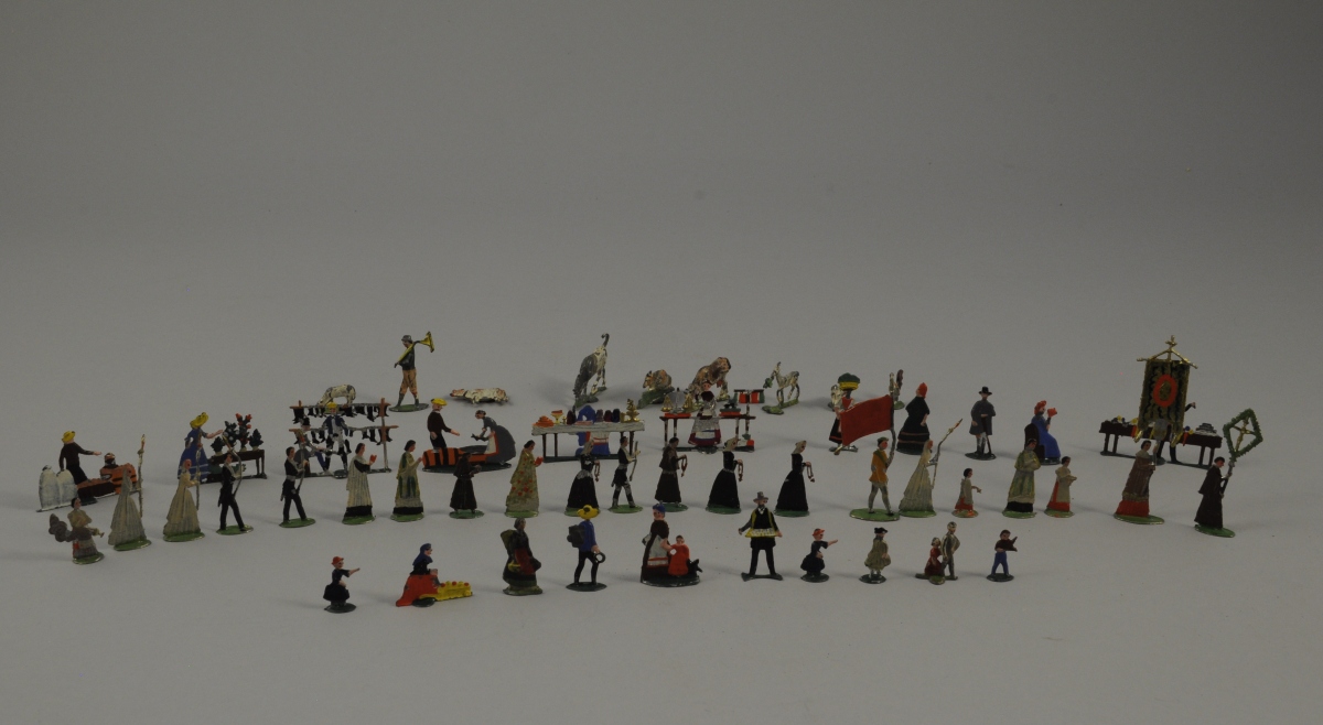 LE VILLAGE. 51 FIGURINES en métal peint comprenant trois ensembles : la procession (21 personnages), le marché (21 personnages) et le troupeau (9 personnages dont animaux).