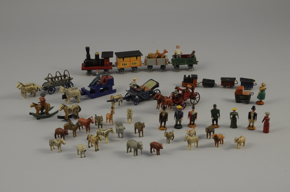 LE CIRQUE. 42 FIGURINES en bois polychrome comprenant 4 attelages (pompiers, charrette, landeau, traineau), 2 trains (trois wagons grand modèle, trois wagons petit modèle), 8 personnages dont clowns, 2 chevaux à bascule, 1 nounou et son landeau d'enfant, 25 animaux de cirque.