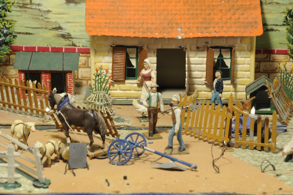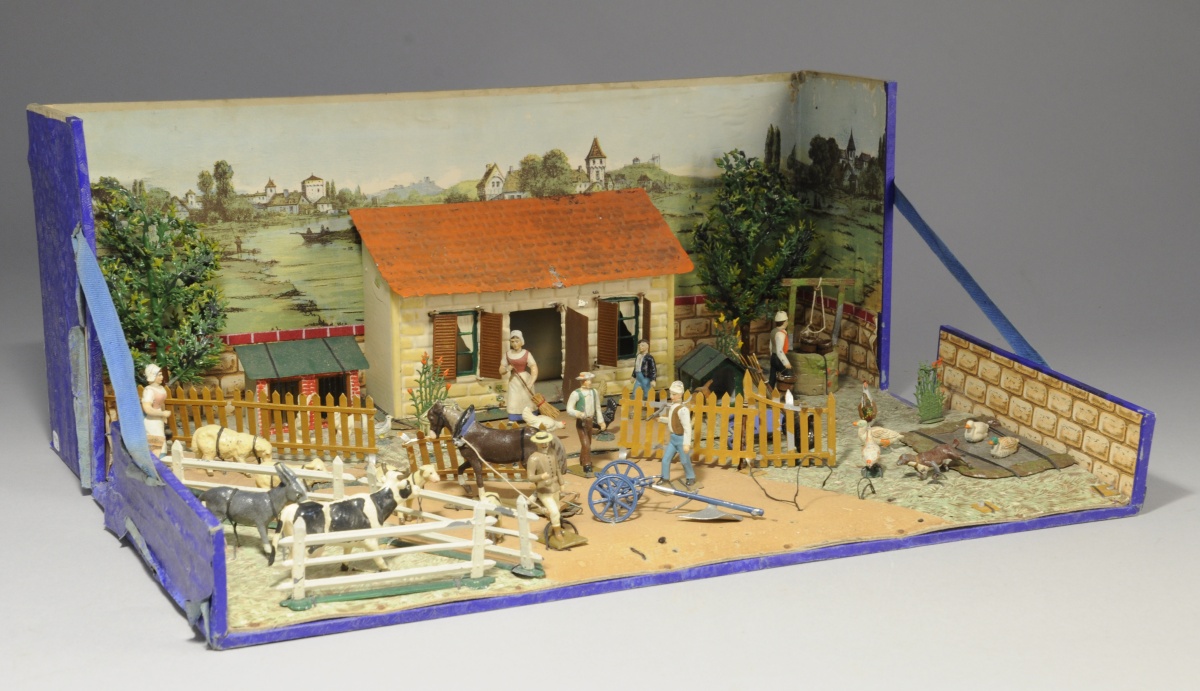 LA FERME. Boite en carton ouvrable comprenant une cour de ferme dans un décor chromolithographié de fleuves et paysage comprenant des éléments en aluminium peint (ferme, clapier à lapins, niche, puits, charrue, 9 barrières, 2 arbres, marre, fleurs) et d'autres en plomb peint (7 personnages tels fermiers, fermières et enfants, 21 animaux tels cheval, vaches, âne, moutons, lapins, poules, chiens, canards, dindon, pigeon).