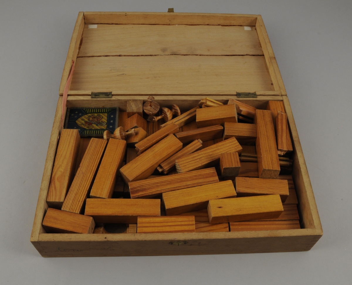 LES JEUX ET JOUETS FRANCAIS. JEU de Construction Architecture Française comprenant différentes pièces de construction en bois, 3 vitraux en papier coloré fixé sous verre. Dans une boîte en bois.