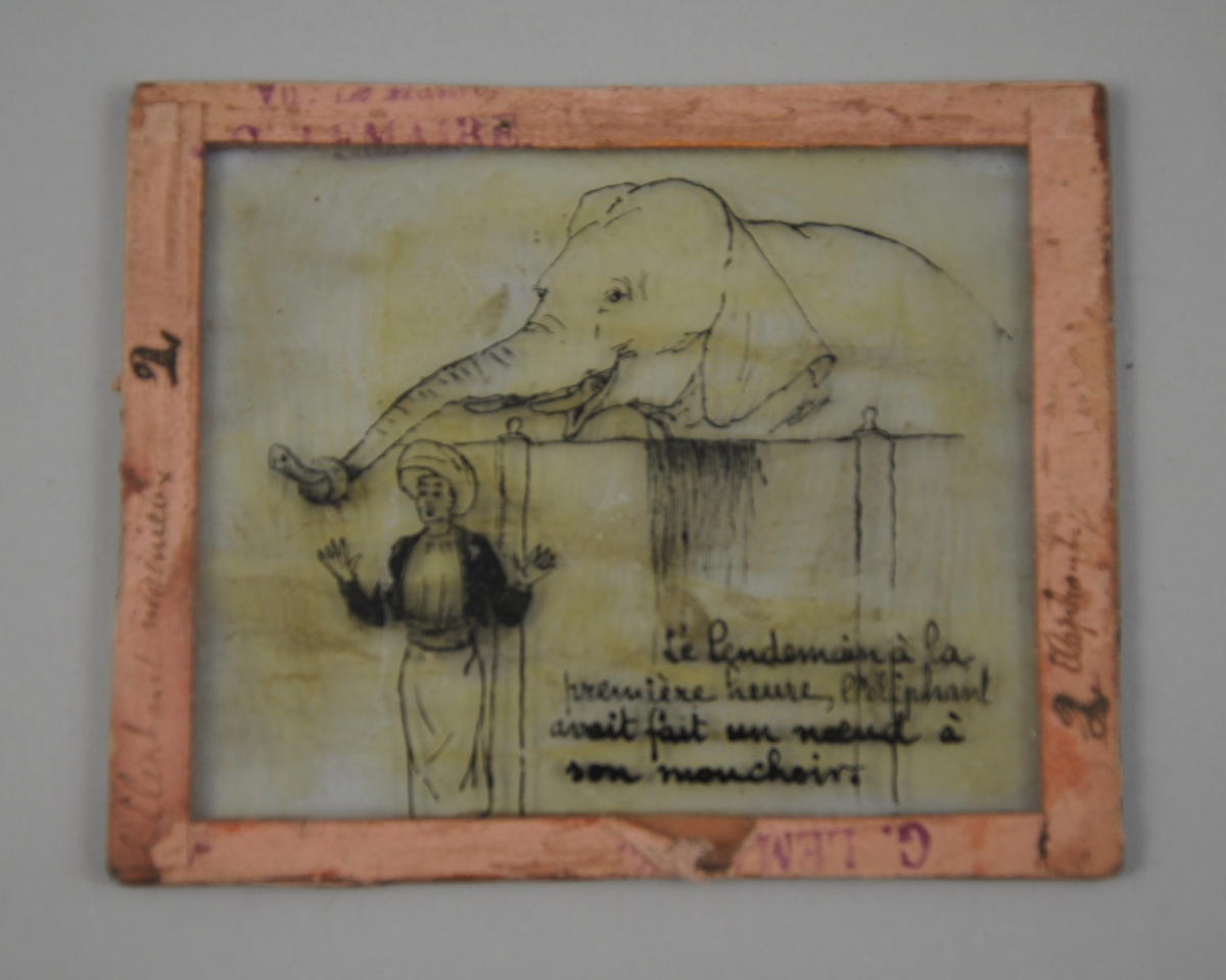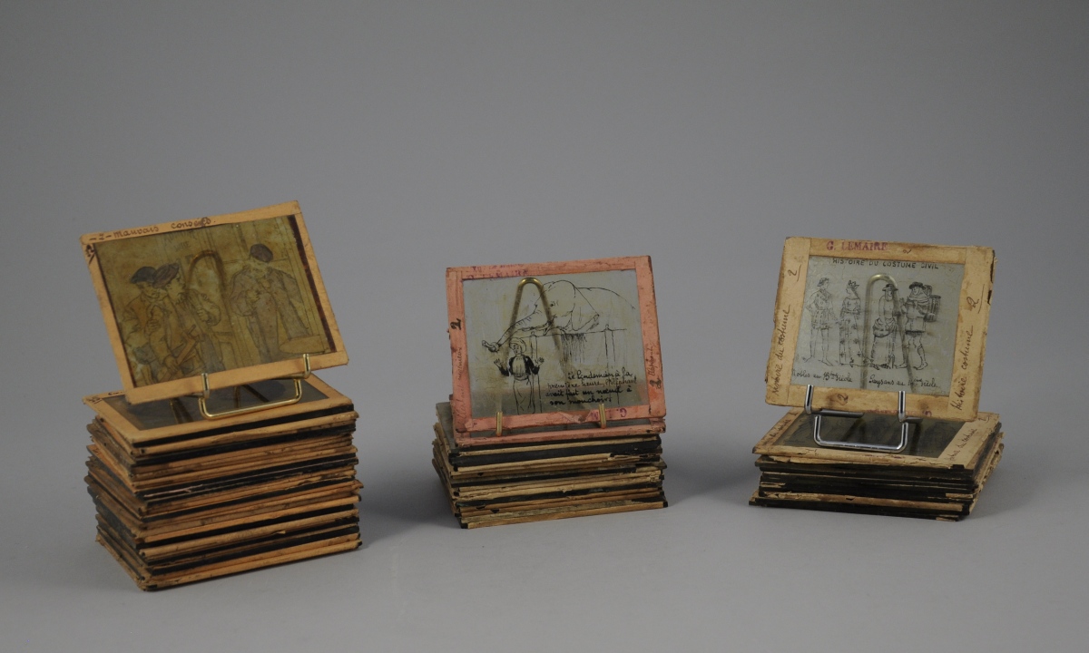 60 PLAQUES DE VERRE POUR LANTERNE MAGIQUE, de forme rectangulaire, certaines en couleurs. 12 sur le thème des costumes régionaux, 17 à sujet humoristique et divers, 31 sur l'ivrognerie.