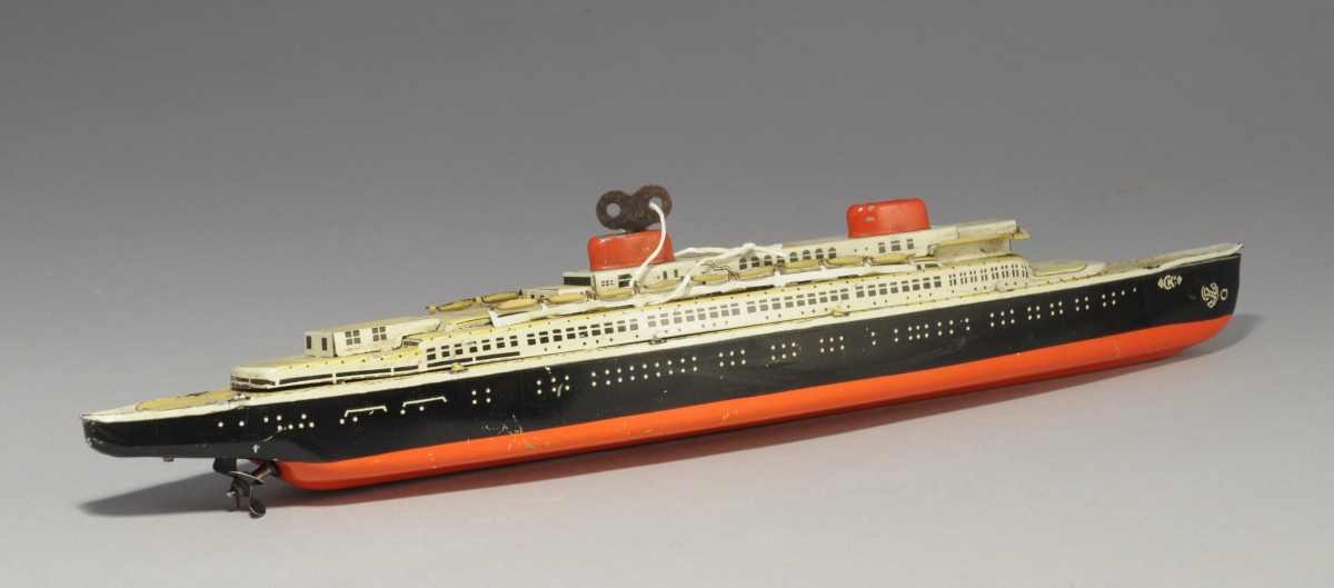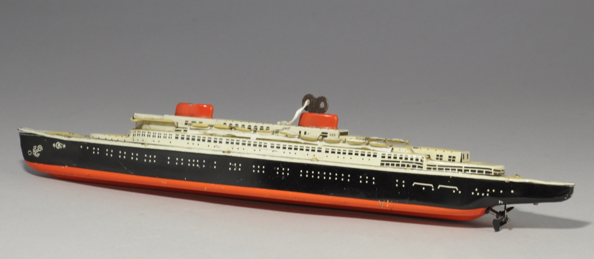 CKO. PAQUEBOT en tôle polychrome à remontage mécanique. Deux cheminées, hydravion peint.