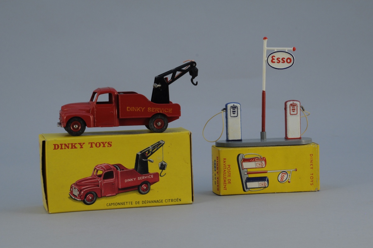 DINKY TOYS. Voiture et pompe à essence avec boites.- Camionnette...