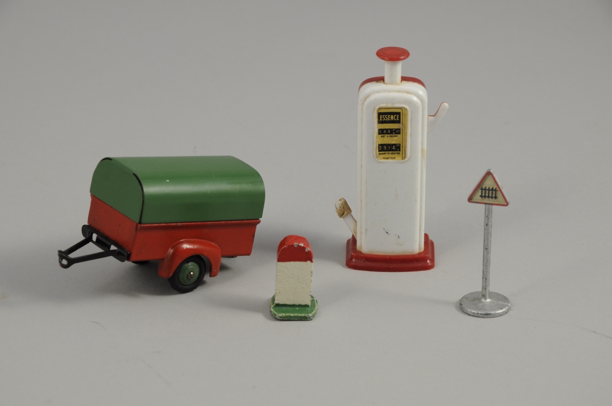 DINKY TOYS, ACCESSOIRES comprenant : une pompe à essence, une borne, une remorque rouge et verte fabriquée en France par Meccano et un panneau de signalisation de barrière de chemin de fer DINKY TOYS, fabriqué en France par Meccano.