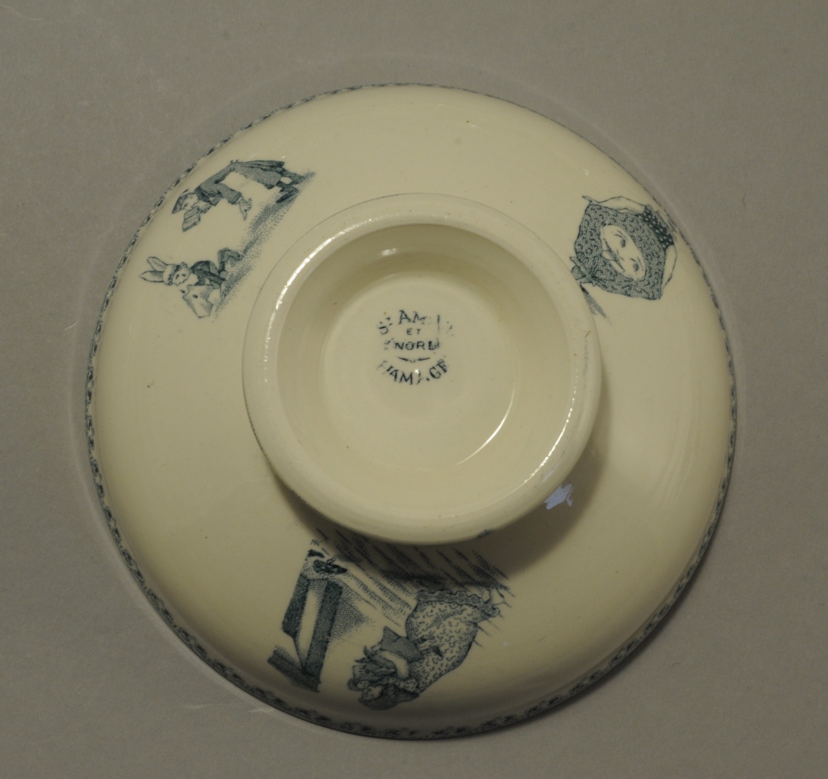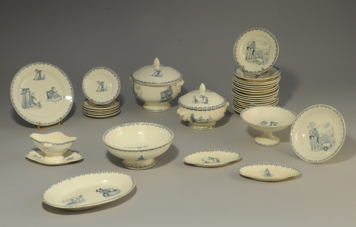SAINT-AMAND. DINETTE DE POUPÉE en faïence de 34 pièces à décors imprimé des jeux de l'enfance comprenant : 12 assiettes plates, 6 assiettes creuses, 6 petites assiettes, 1 légumier, 2 compotiers, 2 petits plats ovales, 1 grand plat ovale, 1 plat rond, 1 petite soupière, 1 grande soupière et 1 saucière.