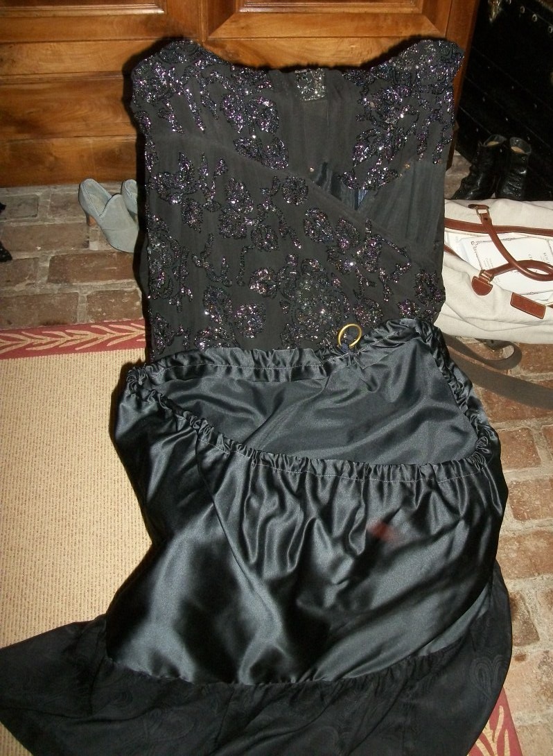 ROBE griffée Cécile Lafontan, Paris, circa 1930, crêpe noir brodé en perles de geai de branches fleuries japonisantes (restauration conservation).