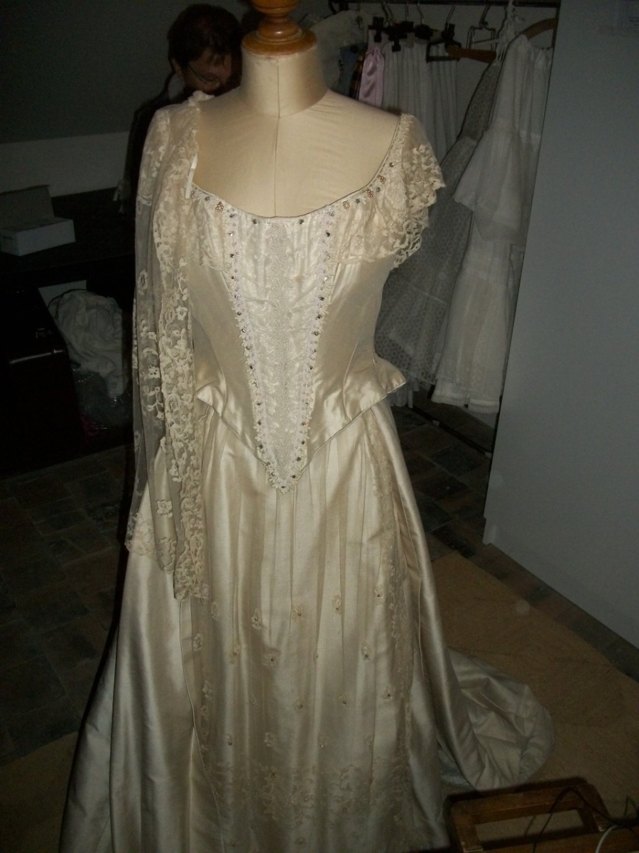 ROBE à tournure, jupe et caraco, pour le cinéma, style du XVIIème siècle, soie sauvage crème, devant de la jupe et pièce d'estomac en tulle brodé, col de tulle brodé.