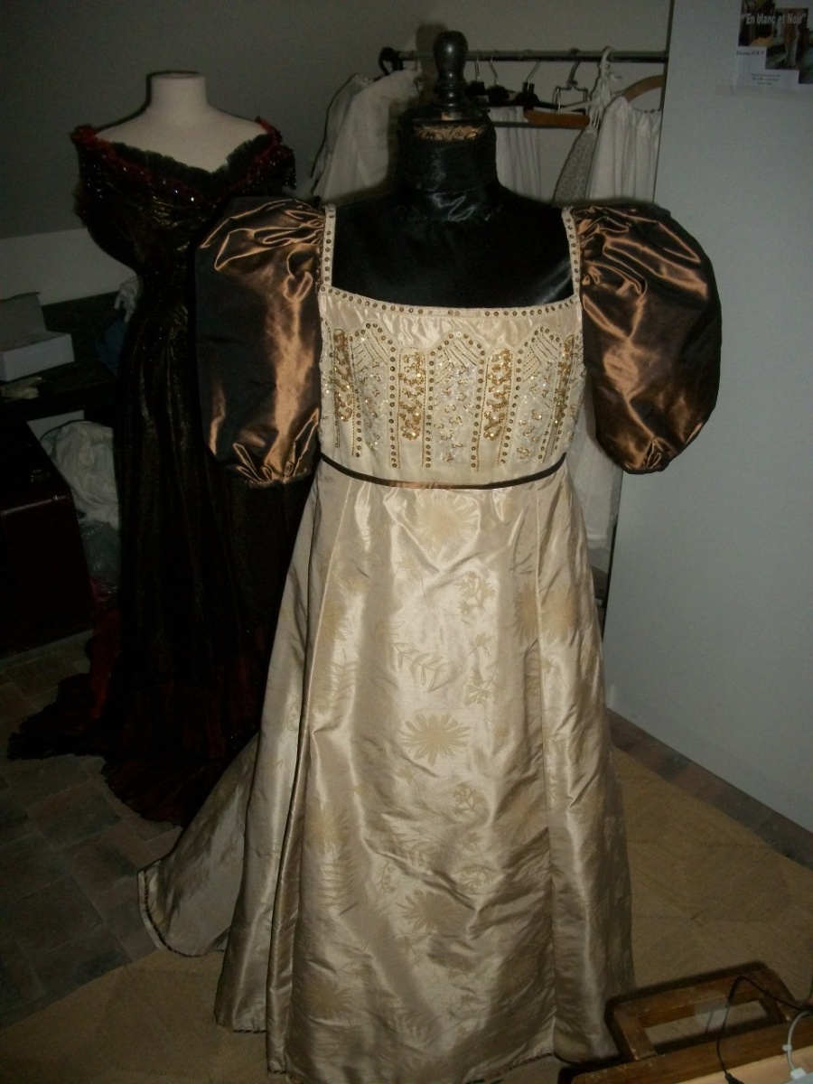 ROBE pour le cinéma, style Romantique, soie sauvage crème décor liseré de fleurs, bustier brodé en perles de verre, manches gigot en satin chocolat.