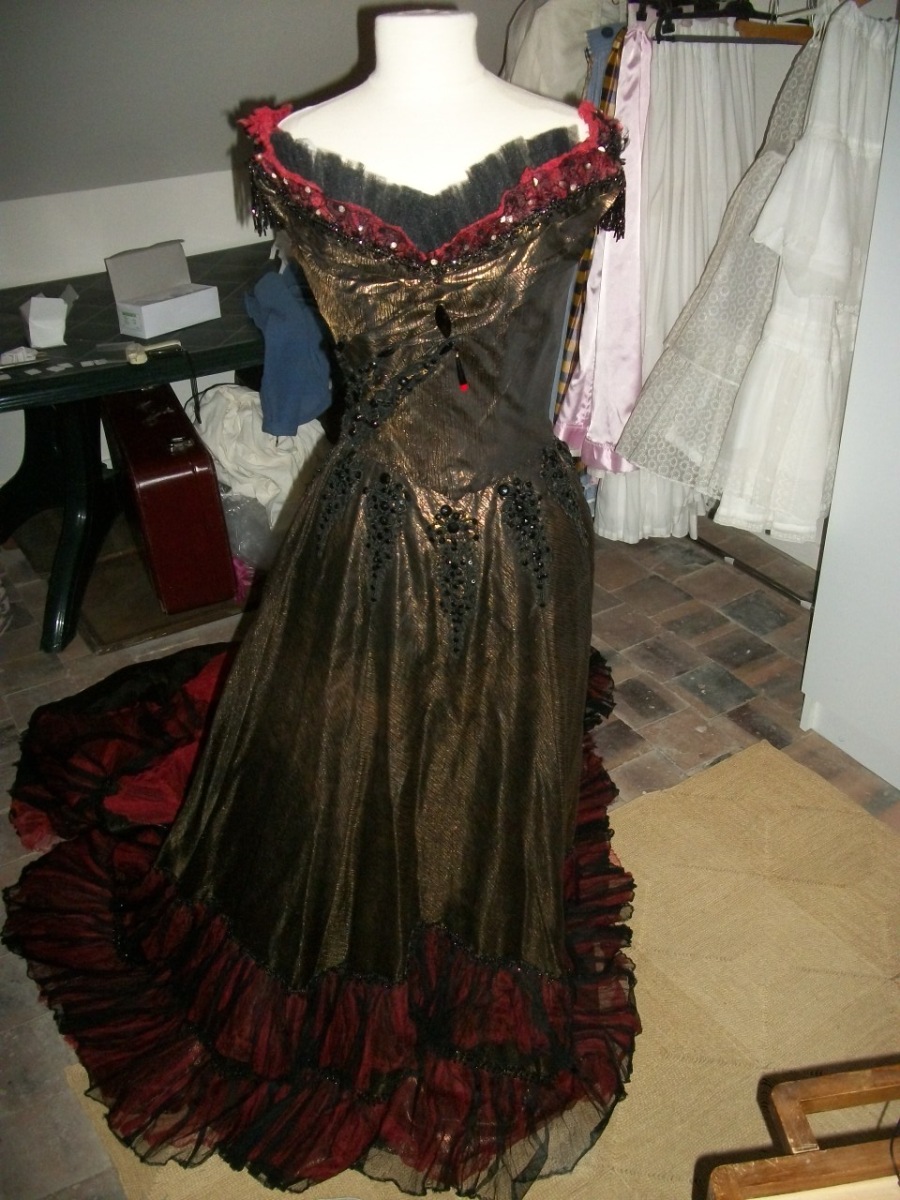 ROBE à traine pour le film Moulin Rouge, brocard noir et or, soutaches à la ceinture, bustier de dentelle, traine couverte de volants de tulle rouge et noir.