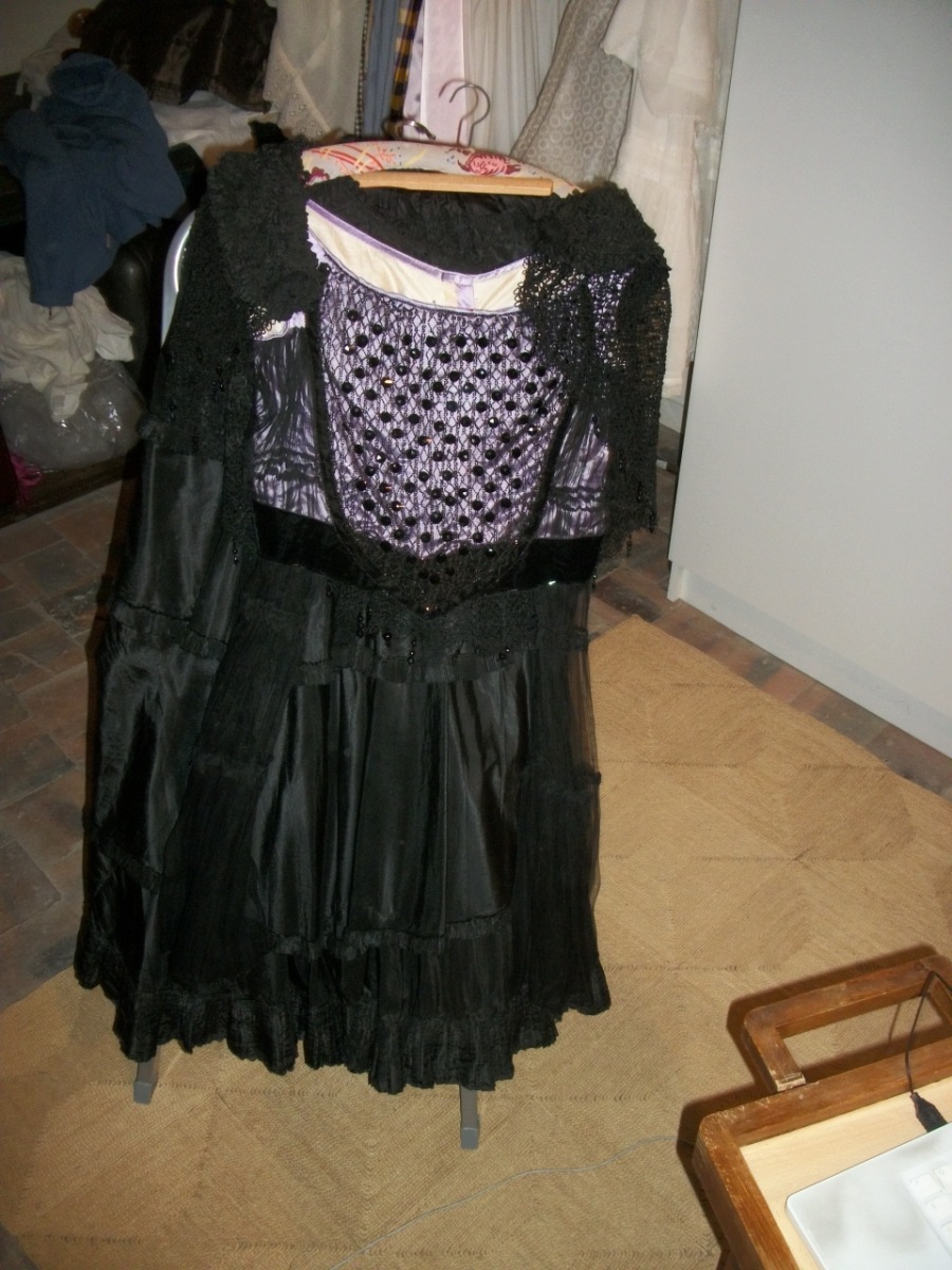 ROBE constituée d'une jupe, caraco et visite, en partie fin XIXème siècle, jupe à volants de taffetas noir, caraco de satin parme couvert de rubans de velours noir et bouton de geai, visite de soutache noire.