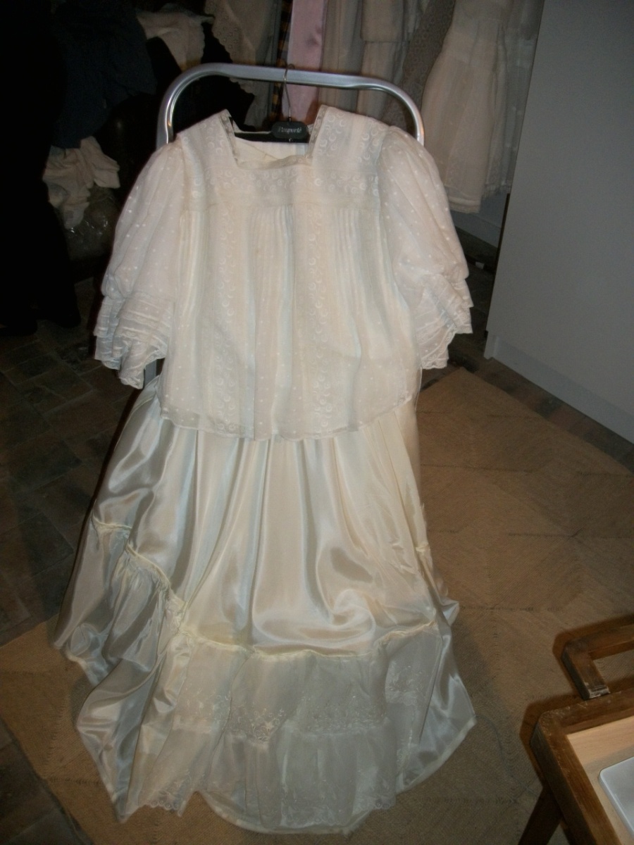 ROBE de mariée, en partie 1900, taffetas blanc couvert de boderie anglaise et volants de dentelle (composition moderne à partir de quelques éléments anciens).