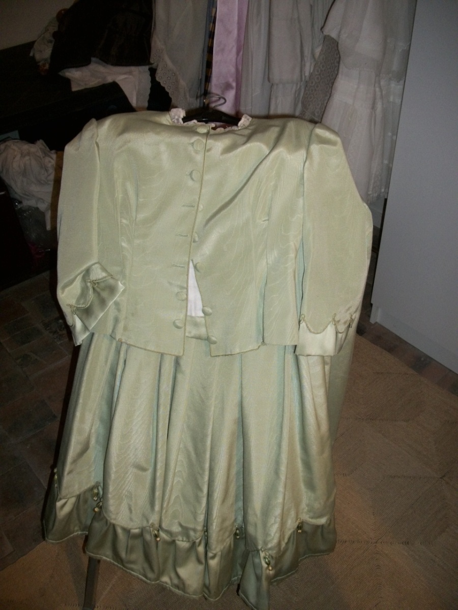 ROBE, JUPE et VESTE, style du XIXème siècle, reps moiré vert amande, volant de satin.