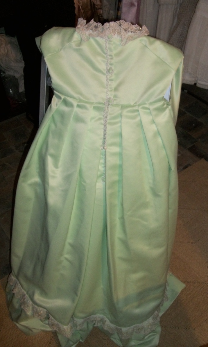 ROBE, style Romantique, satin vert tilleul, volant de dentelle.