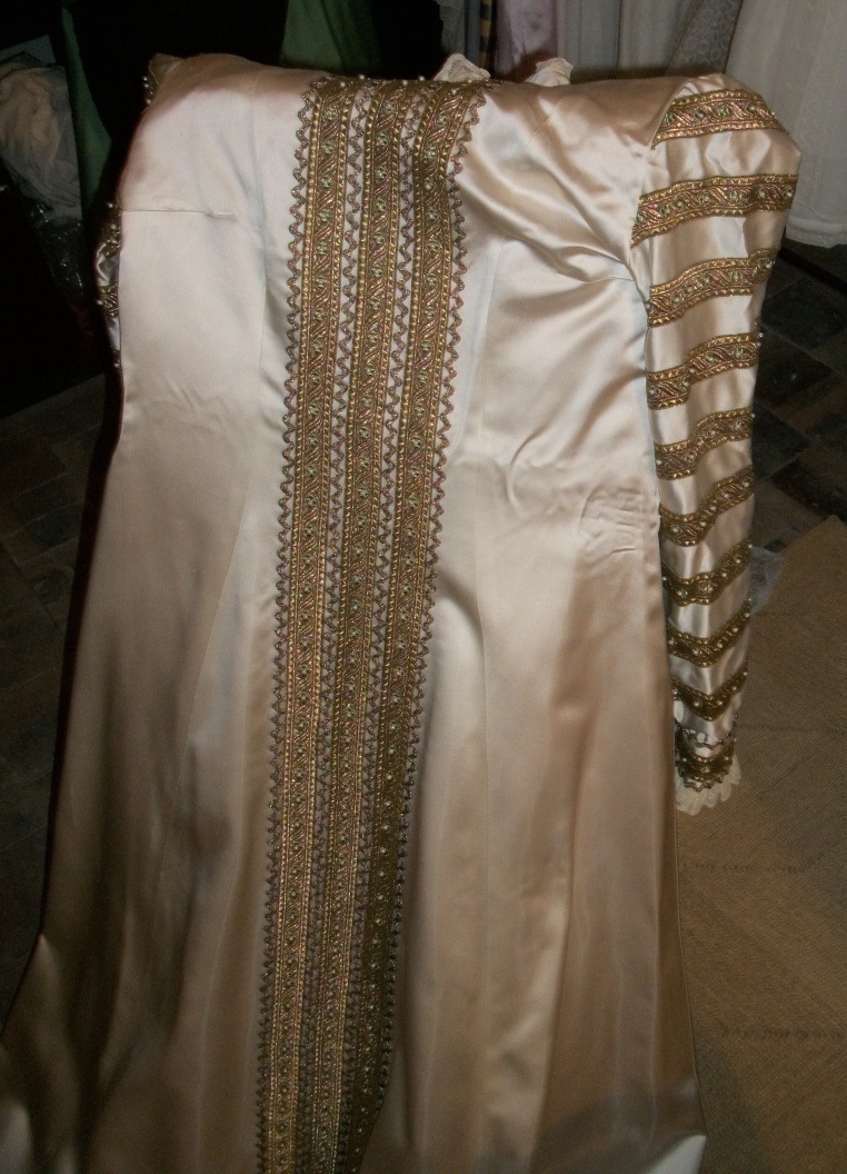 MANTEAU de ROBE, style Renaissance, satin gris perle orné de galon or.