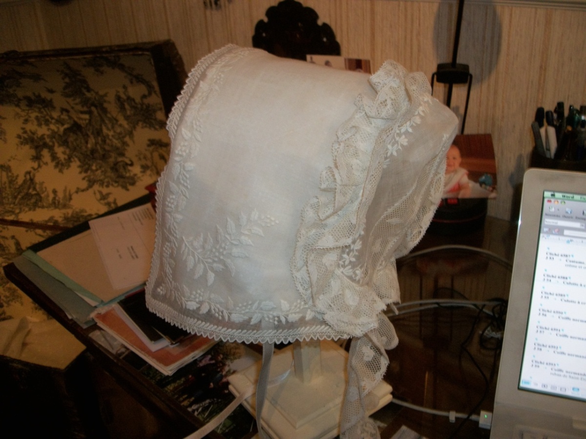 COIFFE NORMANDE, XIXème siècle, linon brodé, dentelle de Valenciennes.