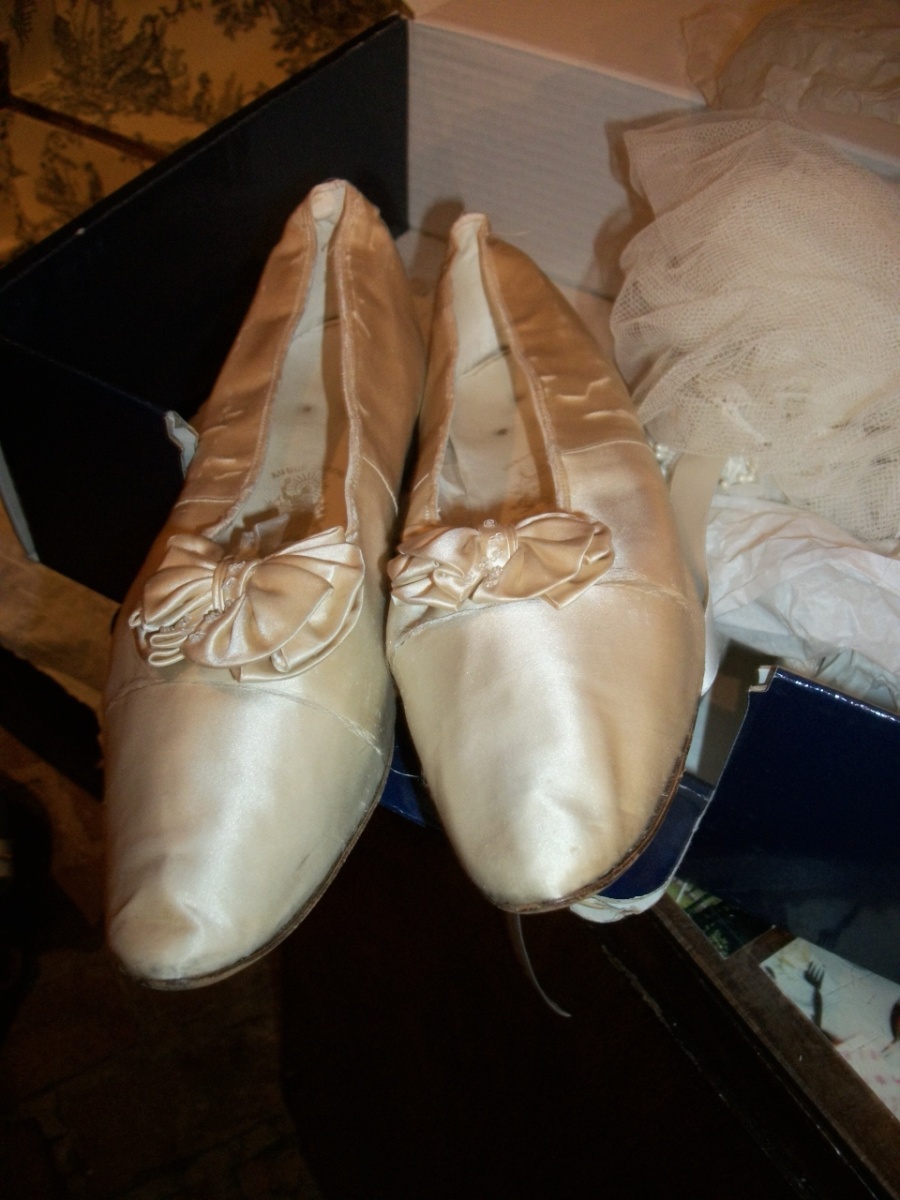 Paire de BALLERINES, XIXème siècle, satin crème et divers.