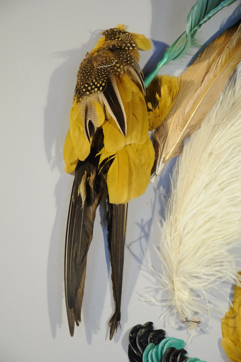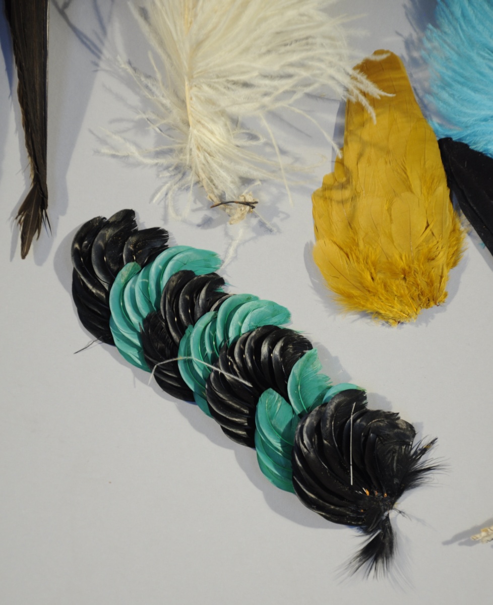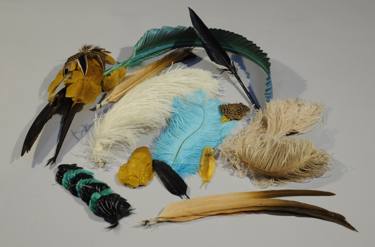 Réunion de PLUMES : autruche, oie, coq... Au naturel ou teintées. Certaines en composition.