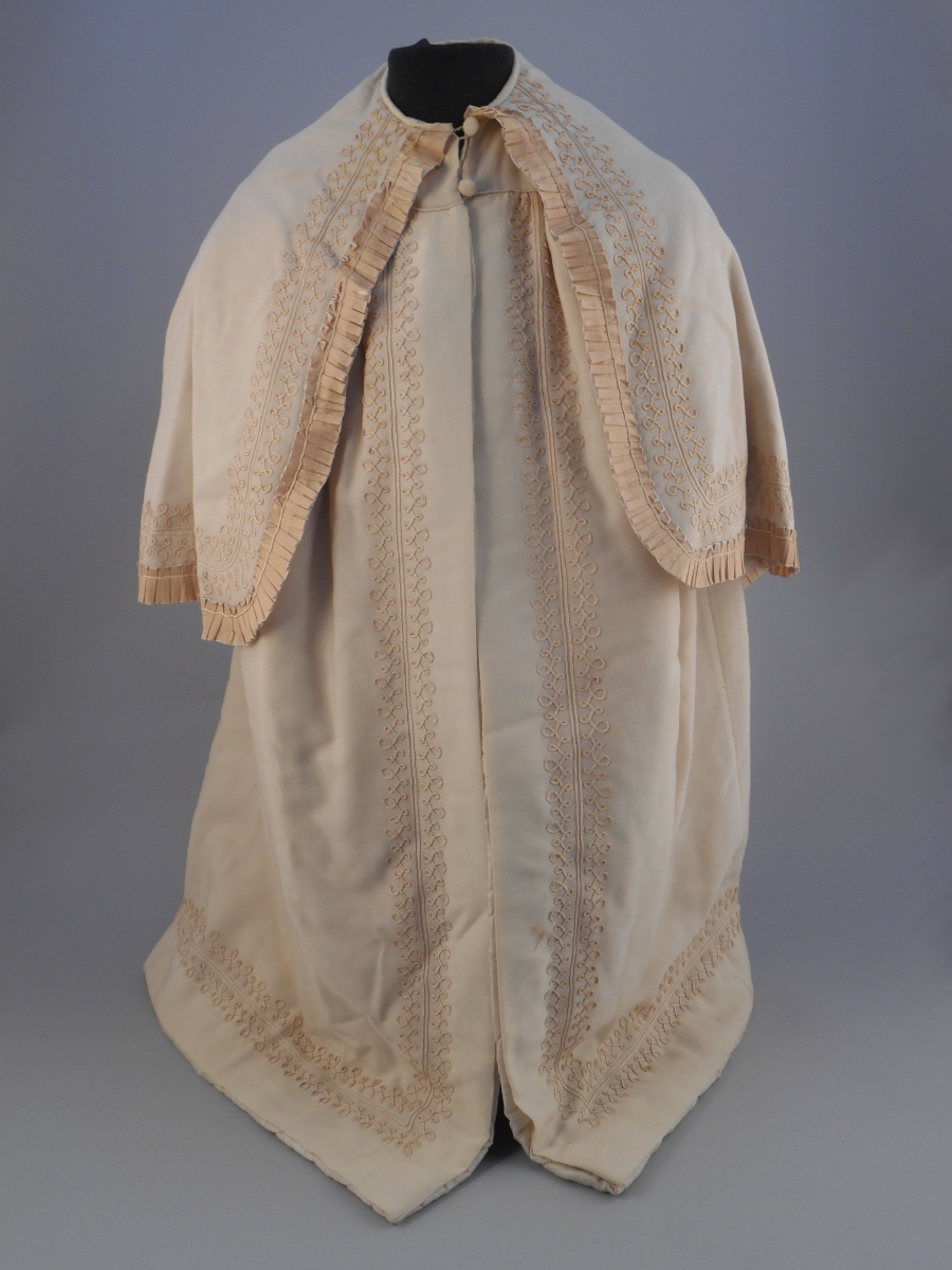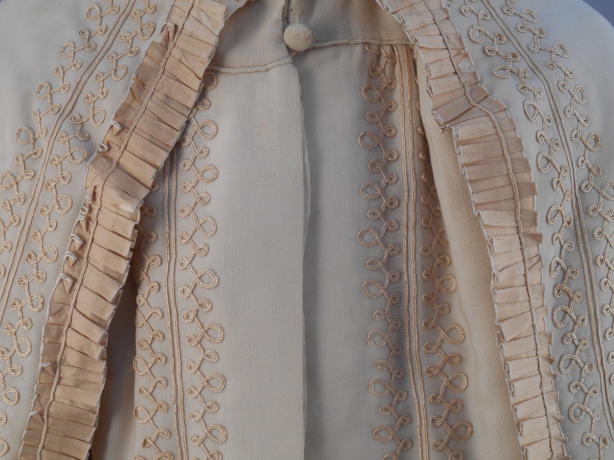 MANTEAU de BAPTÊME, à camail, circa 1900, étamine de laine ivoire, brodé de soutache, molletonné, doublé de taffetas.