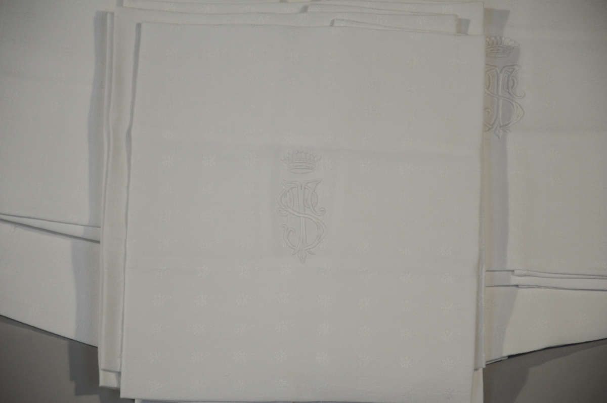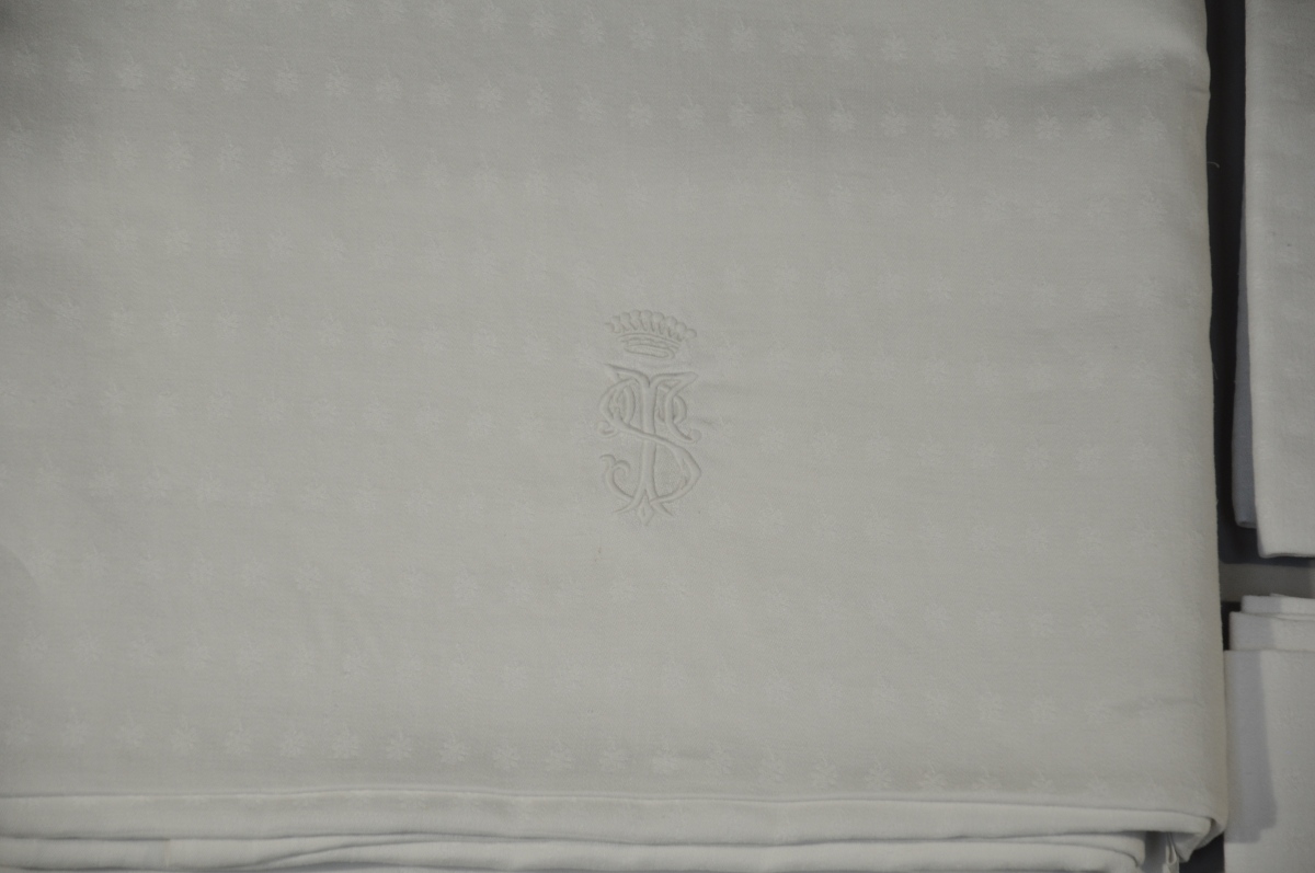 16 SERVIETTES et 3 NAPPES pour 4 et 14 couverts en coton blanc monogrammé TS à couronne comtale. Les nappes : 142 x 164, 180 x 243, 178 x 242 cm.