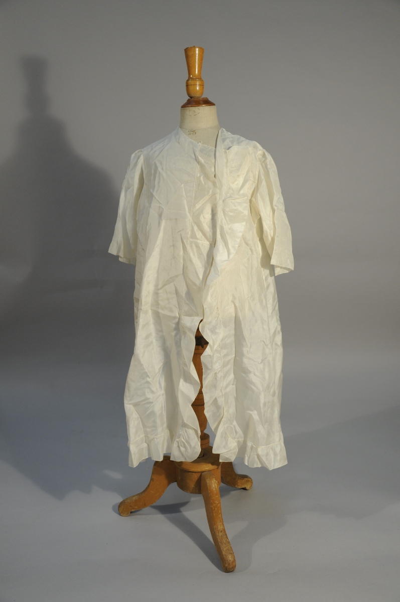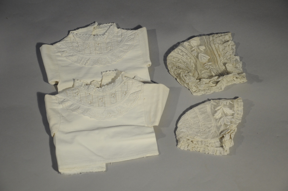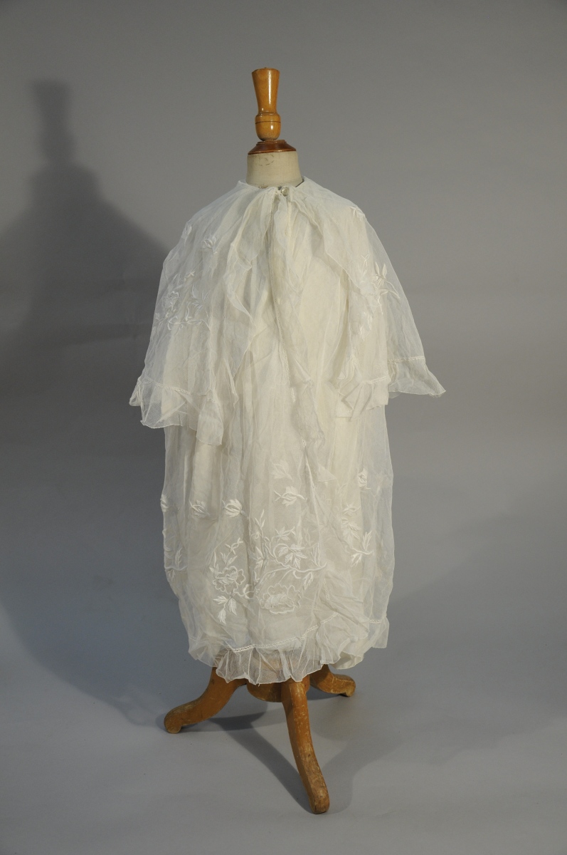 ROBE de BAPTÊME, manteau en taffetas blanc, manteau de tulle brodé, deux bonnets en tulle brodé et deux petites chemises.