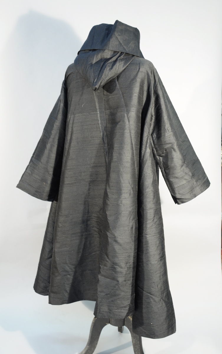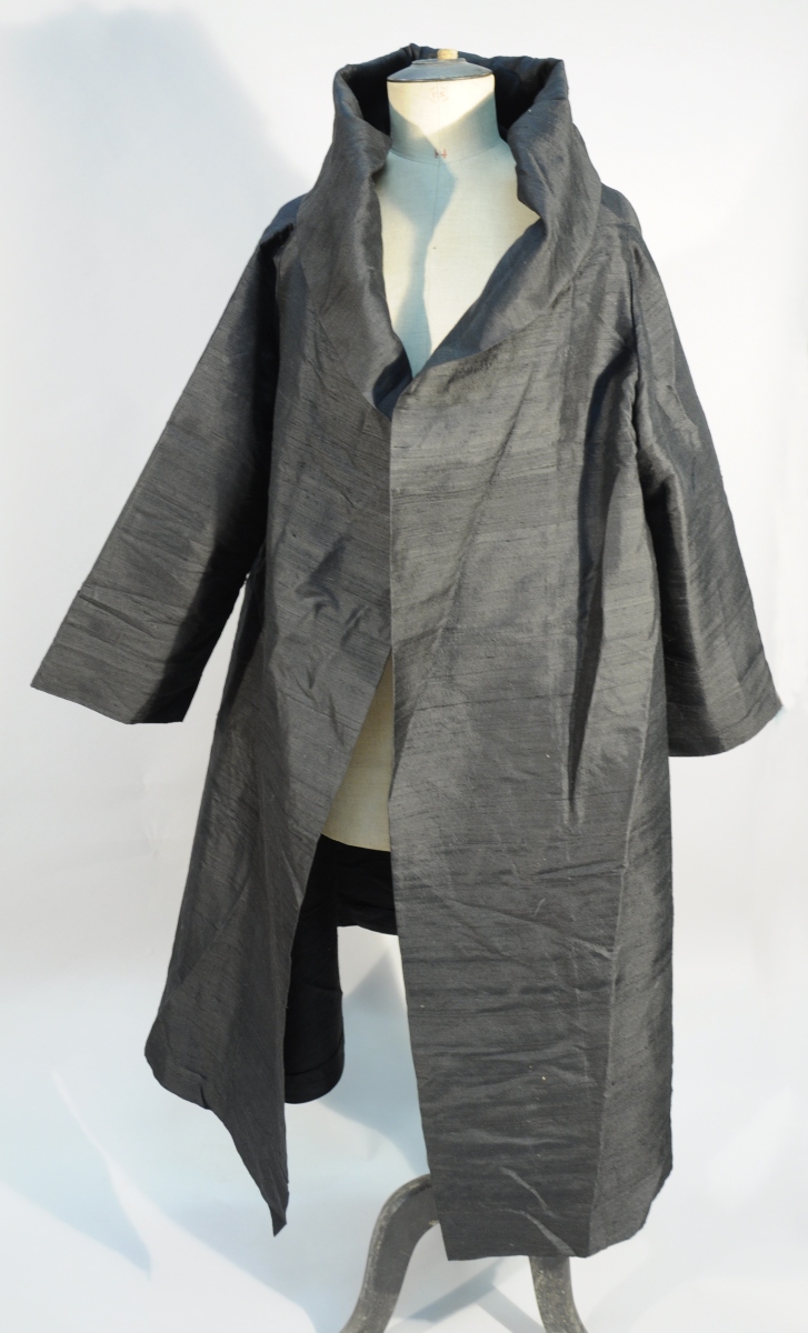 MANTEAU en soie sauvage noire, attribué à LANVIN.