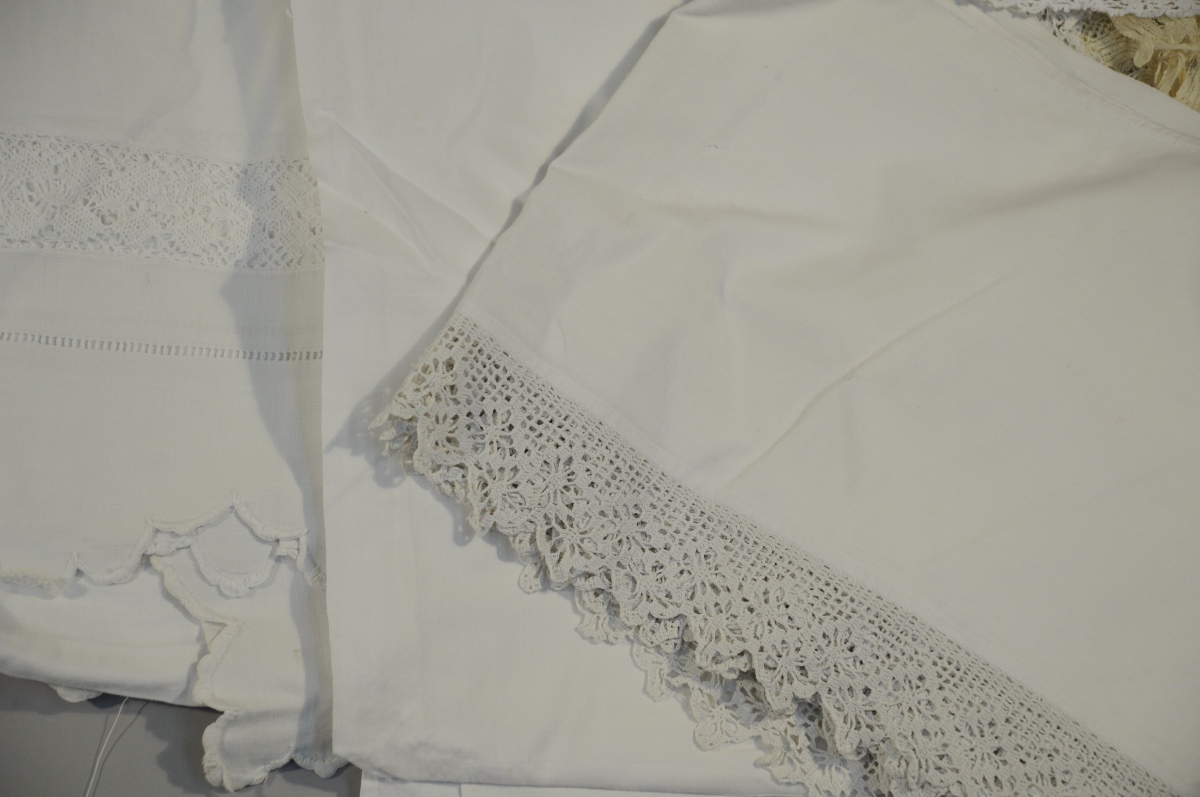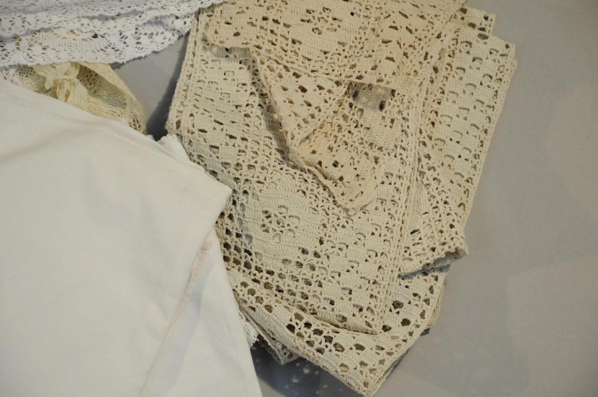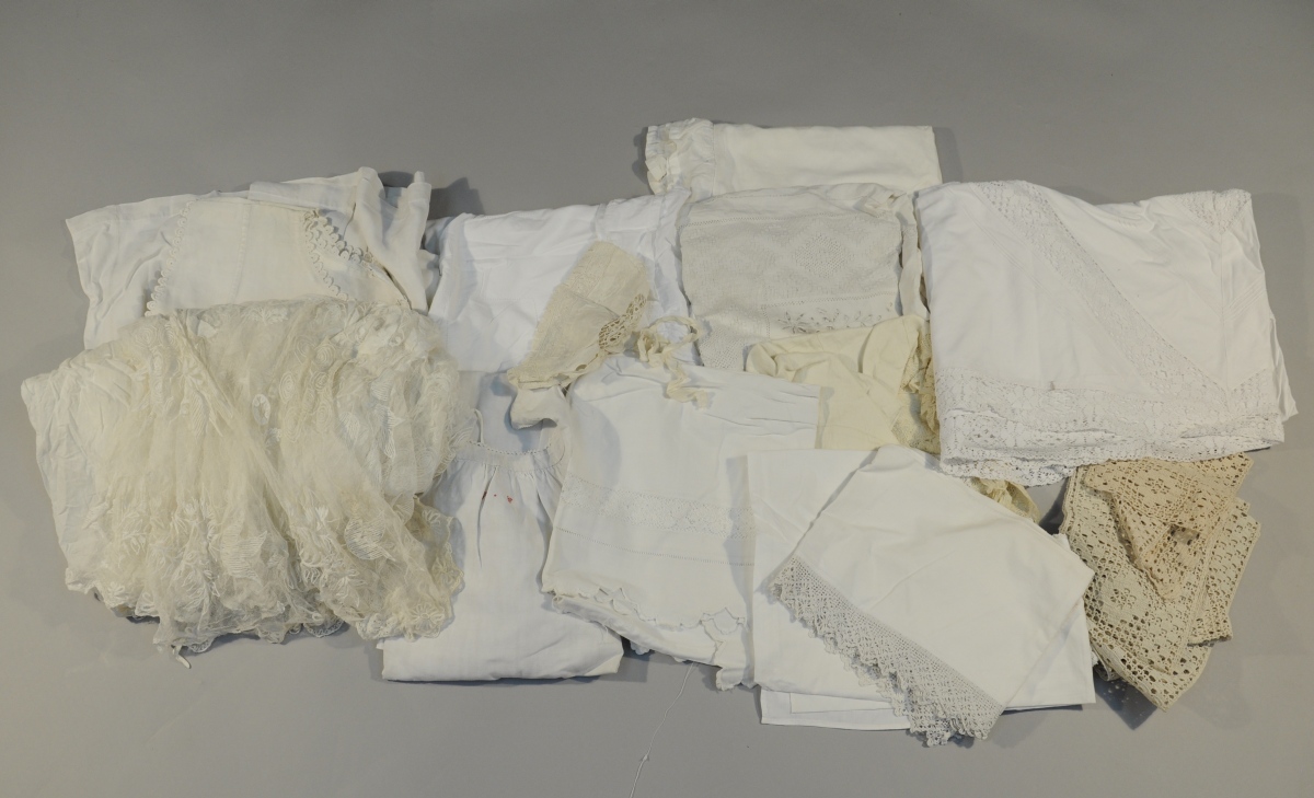Réunion de NAPPES, NAPPERONS, TABLIER, CHEMISE, SURPLIS, BONNET, et divers.
