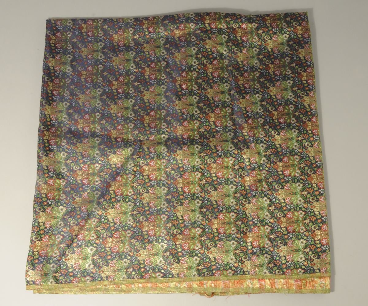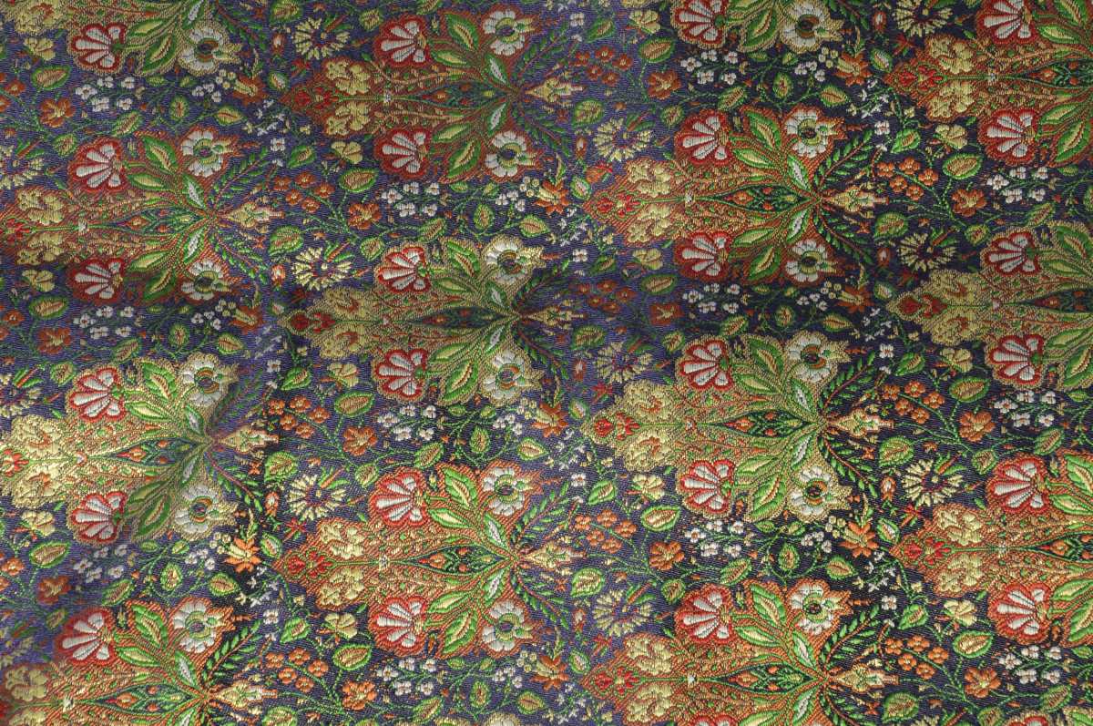 LAMPAS de Syrie. Fond satin bleu, décor lancé polychrome et or de fleurs.