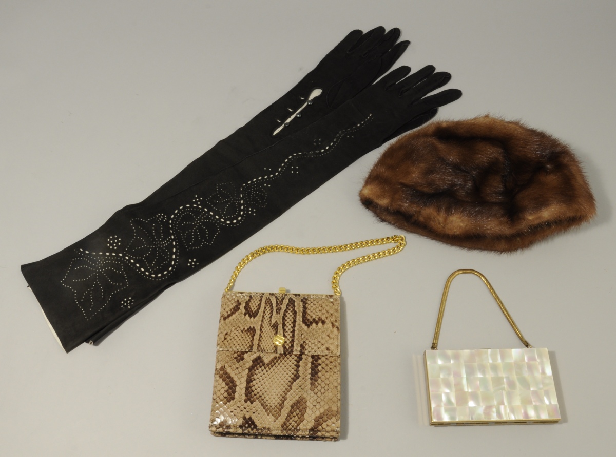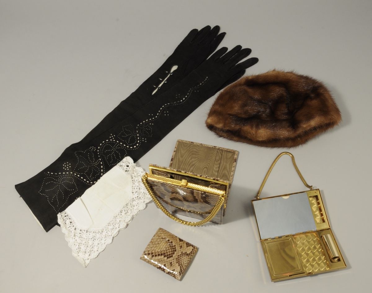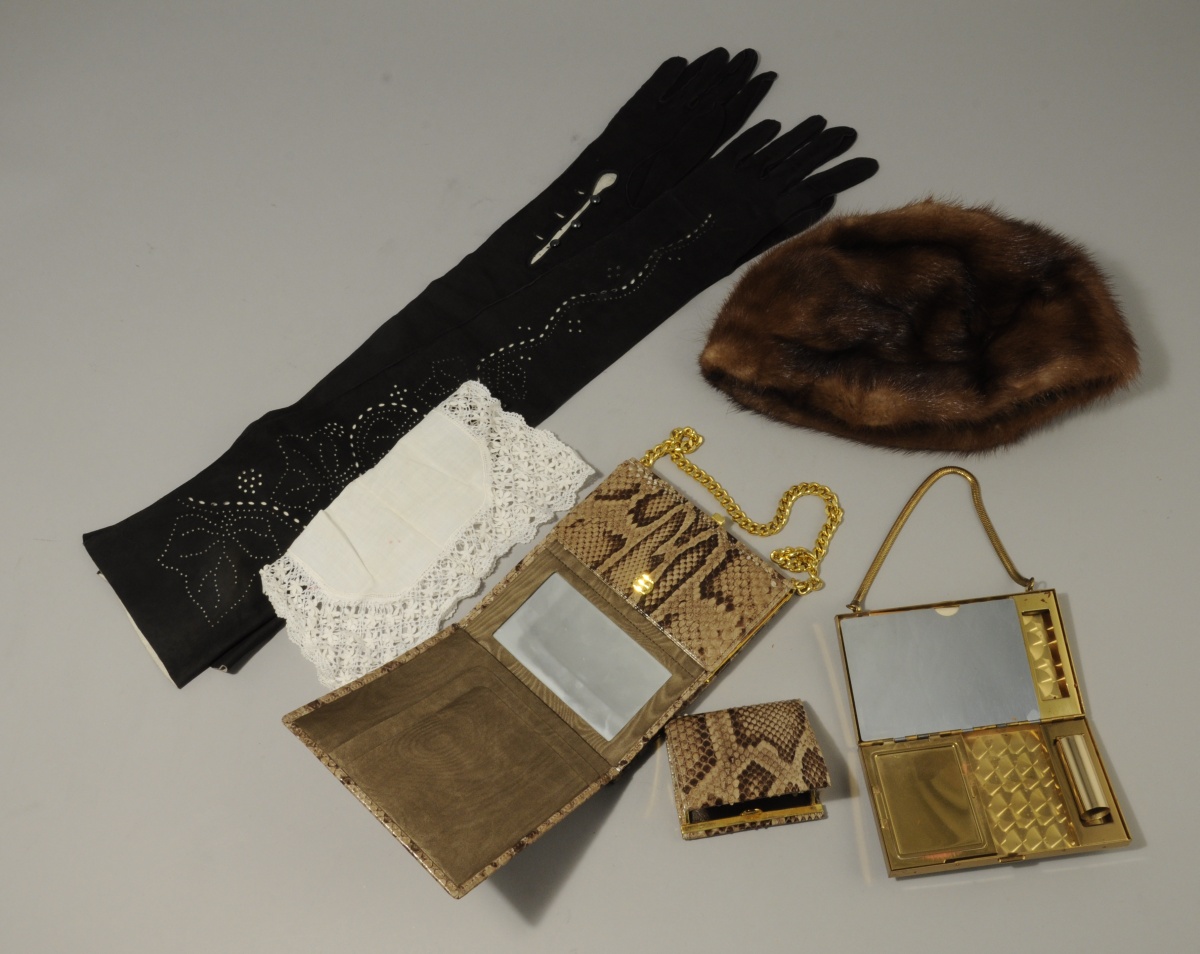 - Sac de soirée en serpent comprenant un porte-monnaie et un mouchoir en dentelles. Une partie portefeuille avec un miroir et une autre de rangement. 13 x 16 cm