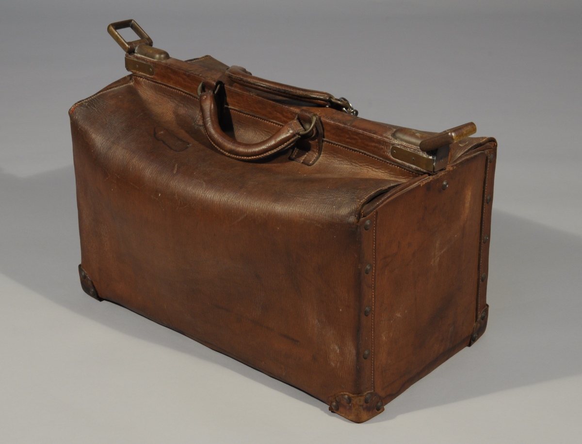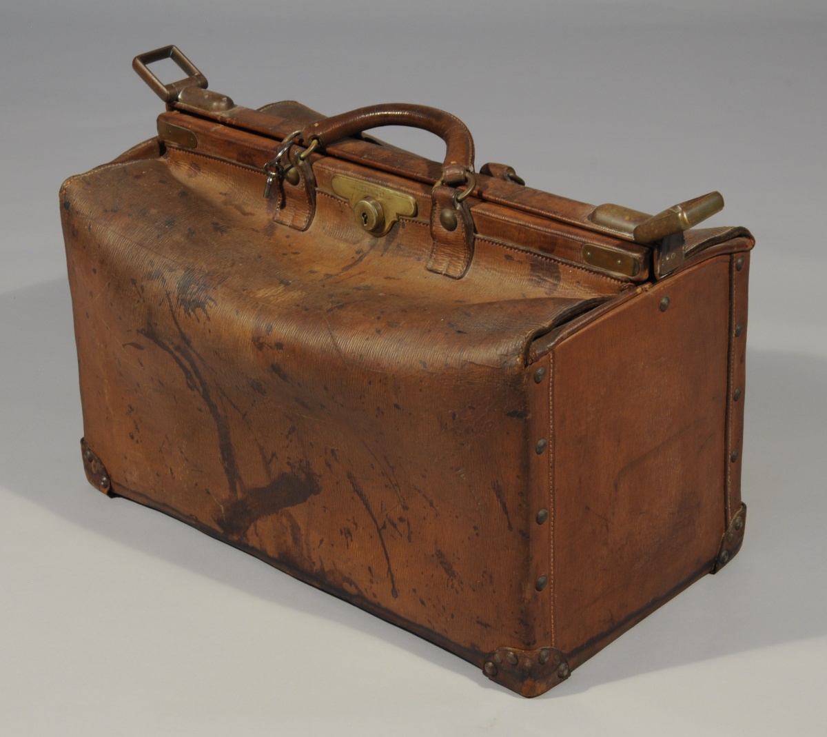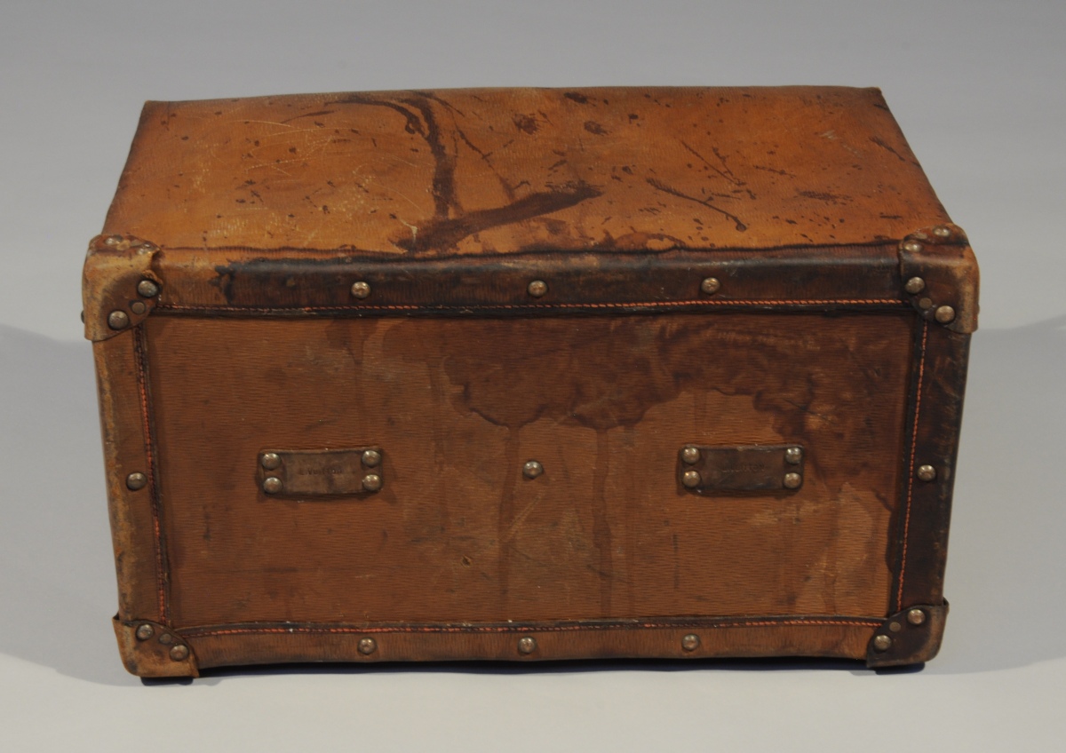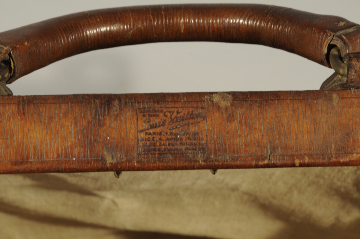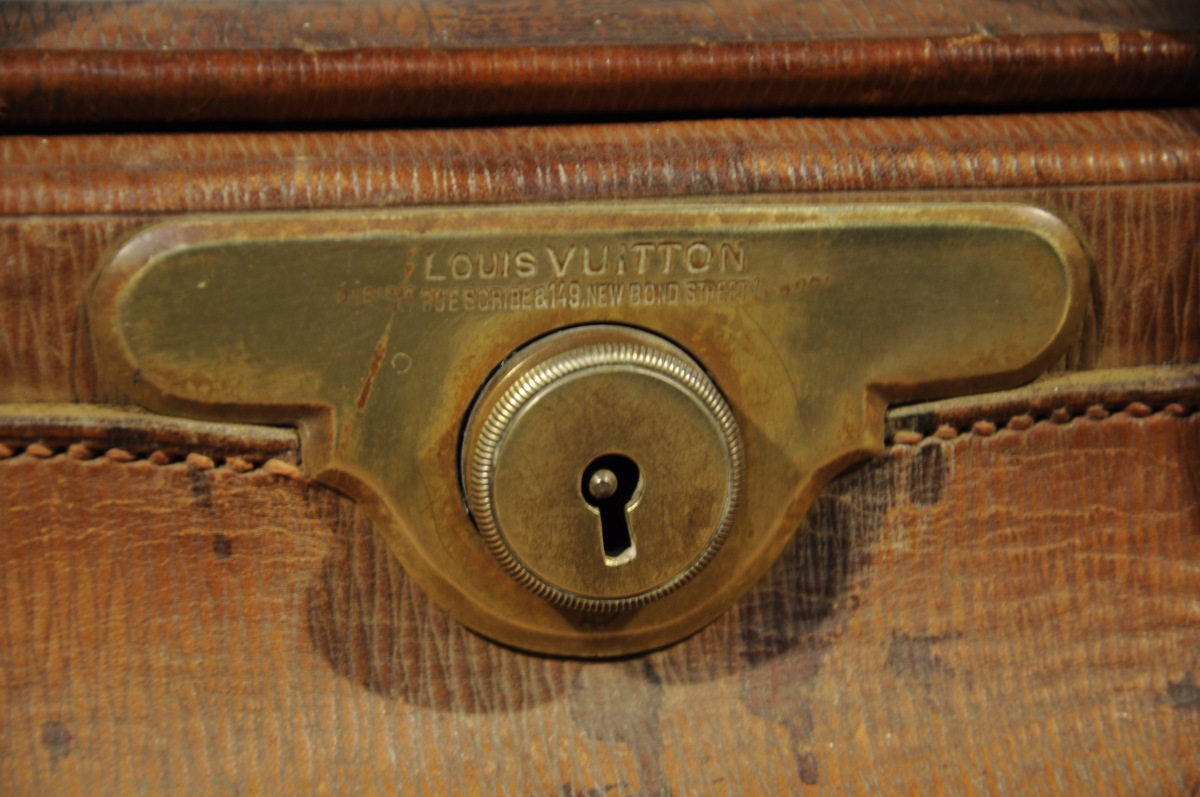 SAC MALETTE de voyage en cuir naturel fauve, deux poignées en cuir naturel, intérieur entoilé avec poche. Signé sur la serrure en laiton verrouillable : Louis Vuitton Paris 7, rue Scriber 149, New Bond street London - et timbre à l'encre violette à l'intérieur : 1?0292. Autre cachet estampé avec 5 adresses.
