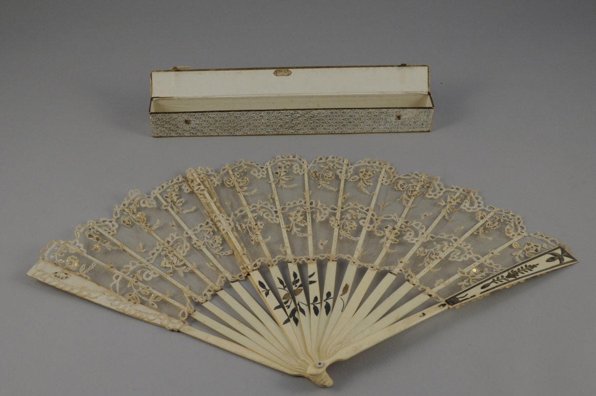 ÉVENTAIL plié. La feuille en dentelle blanche ornée de chutes de fleurs brodée de sequins or. Monture en os incrustée d'un motif floral en métal argenté et doré. Dans une boîte signée "A Giroux & Cie / Rue du Coq St Honoré / à Paris".