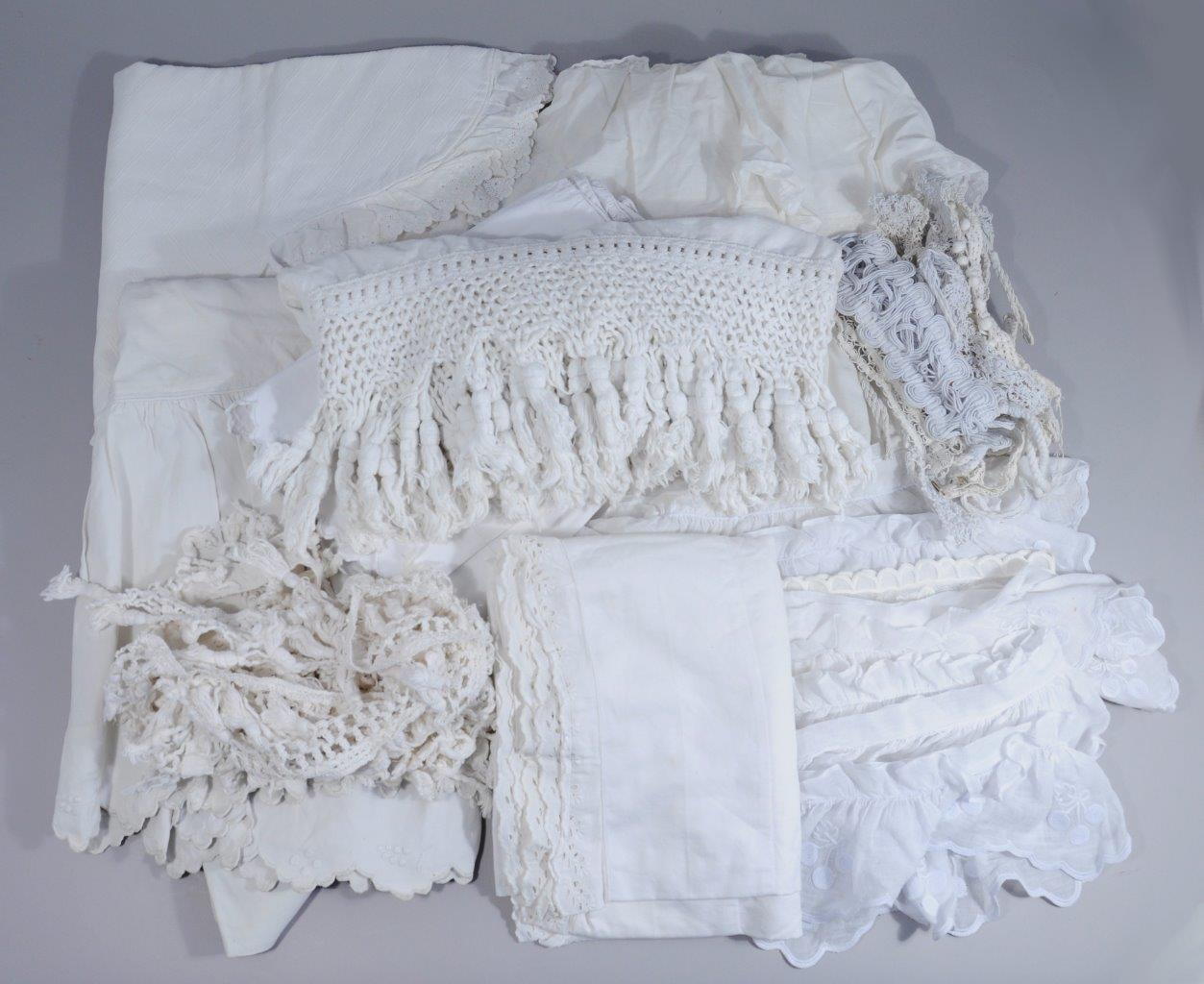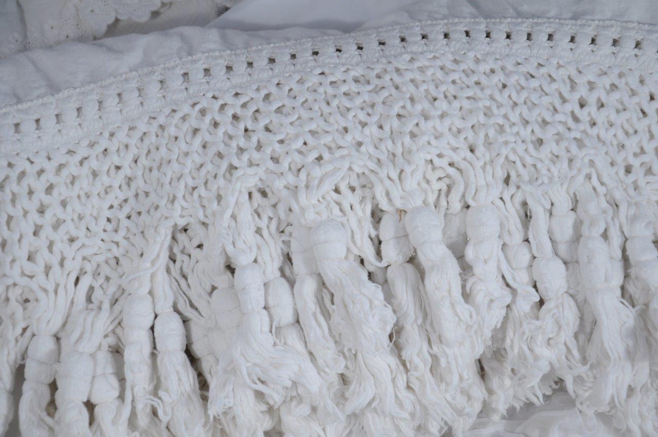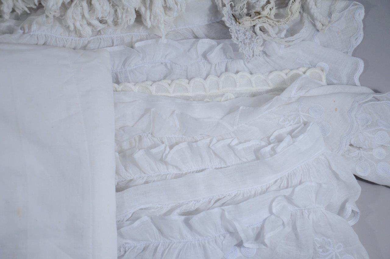 Ensemble composé de 6 embrases à rideaux, mousseline,1 embrasse en broderie sur tulle, mmbrase macrémée, jupon long, jupon double volant mi-long, 2 tours de berceau et un nid d'ange fin XIXe en gros piqué : volant fait main.