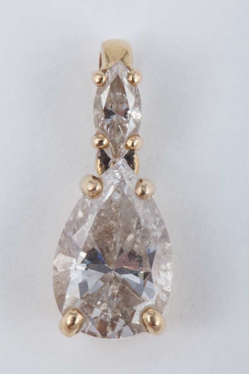 PENDENTIF en or jaune 18K orné de deux DIAMANTS, l'un d'entre eux plus important de forme poire. (Petit manque au diamant).