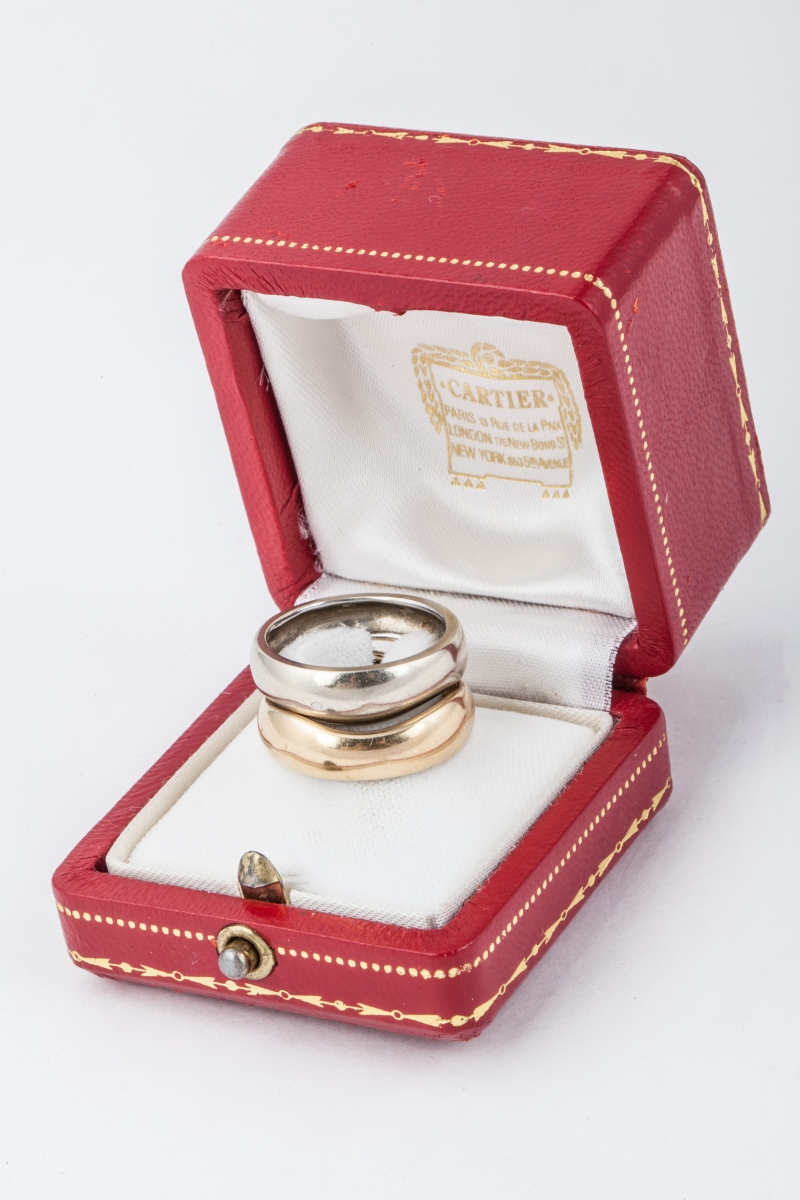BAGUE "LOVE ME" deux anneaux deux ors jaune et blanc. Dans écrin CARTIER.