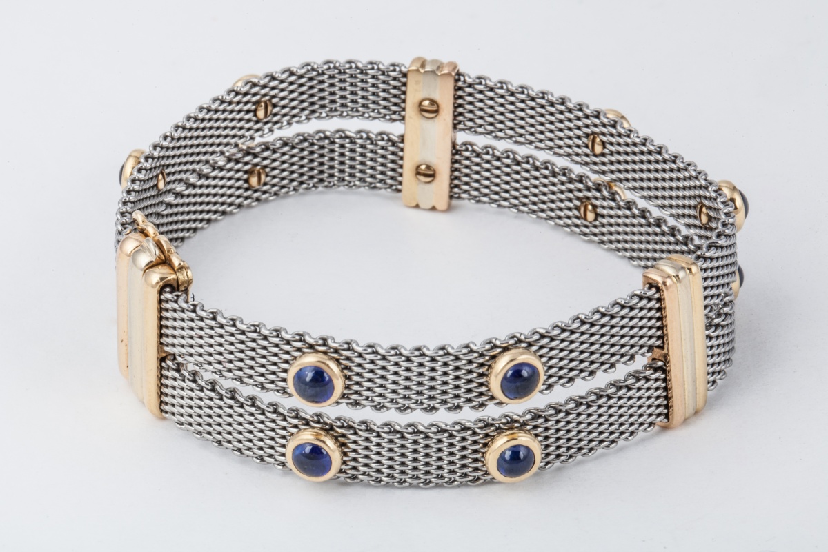 CARTIER. BRACELET à deux liens en acier tressés, ornés de 12 cabochons en saphirs bleus, réunis par trois anneaux trois ors, dont le fermoir. Numéroté 281887. Dans son écrin.