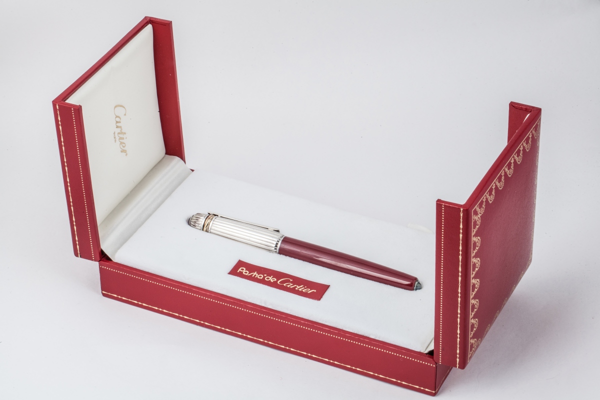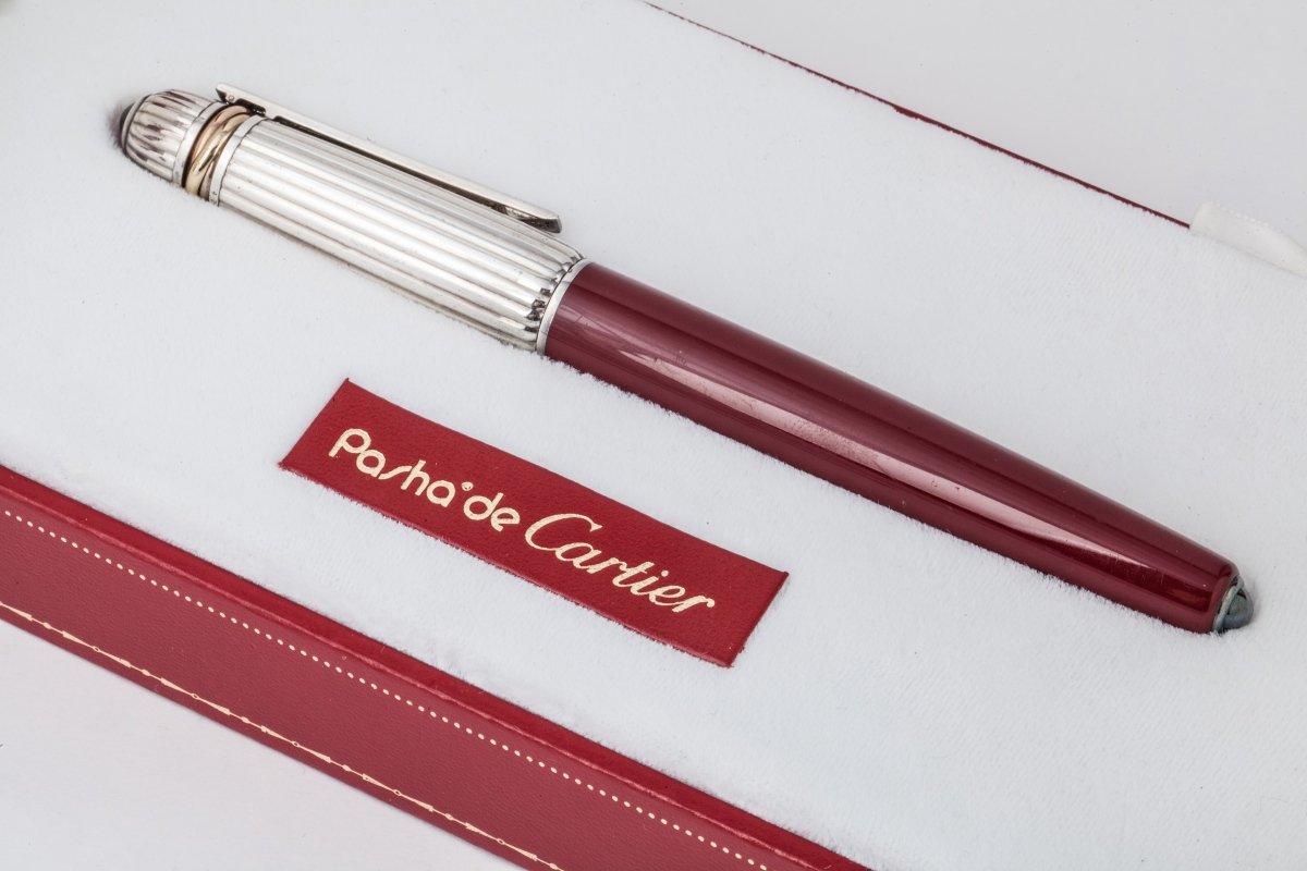 CARTIER. STYLO PLUME PASHA, le corps laqué bordeaux, le capuchon godronné orné d'un cabochon et d'une réplique de la bague trois ors. Signé et numéroté 2226, daté 1989. Plumes en or. Dans son écrin. Certificat de garantie internationale vierge.