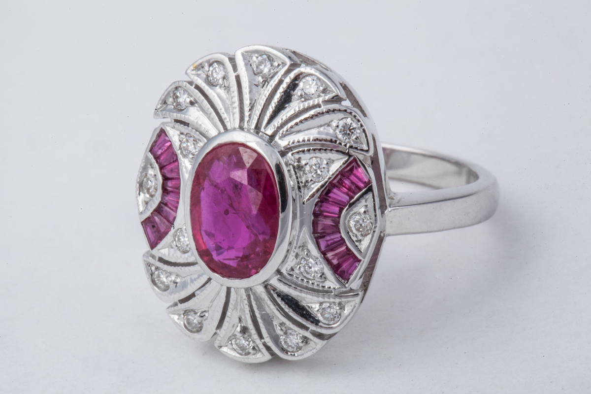 BAGUE de style NAPOLÉON III, en or rhodié, sertie d'un RUBIS taille ovale + 16 rubis taille calibré d'environ 2,05 carats agrémentés de 16 diamants blancs taille moderne d'environ 0,20 carat.