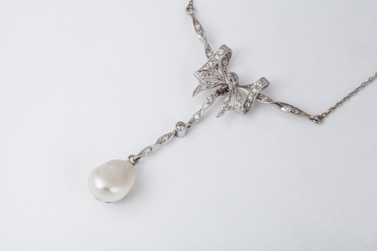 COLLIER NOEUD en platine et diamant. Une parle baroque en chute retenue par un noeud pavé de brillants.