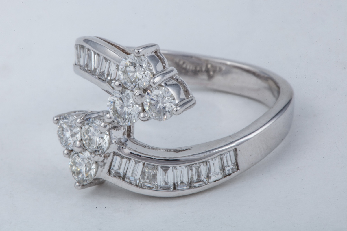 BAGUE VOUS ET MOI en or blanc, sertie de 6 DIAMANTS blancs taille moderne et de 16 diamants blancs taille baguette 1,20 carats.