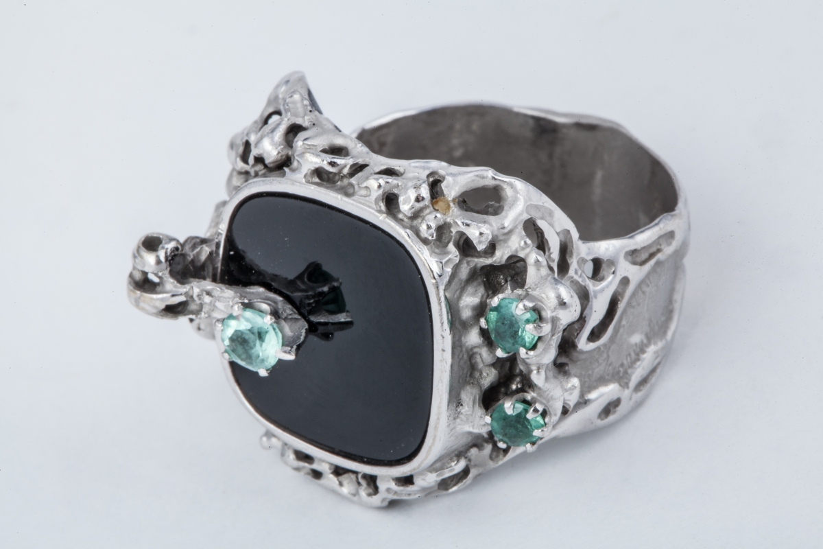 BAGUE stylisée en or gris 18K (750 millièmes), ornée au centre d'une plaque d'onyx de forme coussin, la monture gravée.