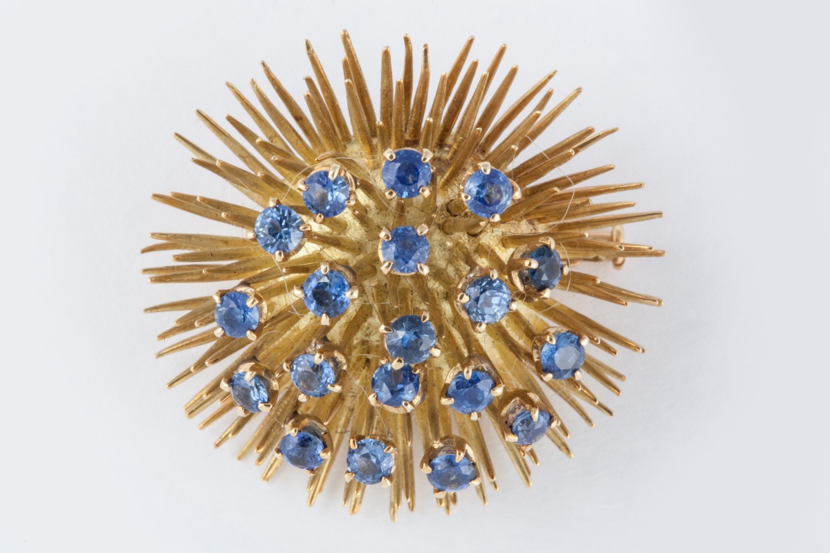 BROCHE FLEUR en or jaune 18K (750 millièmes) de forme ronde, partiellement sertie de saphirs.