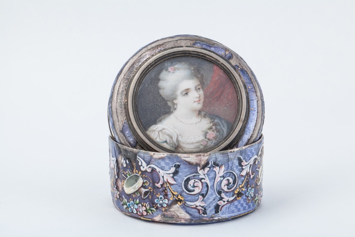 BOÎTE de forme ronde en ARGENT, entièrement décorée en polychromie d'attributs de musique, agrafes et guirlandes de fleurs, le couvercle orné d'une miniature représentant une femme en buste.