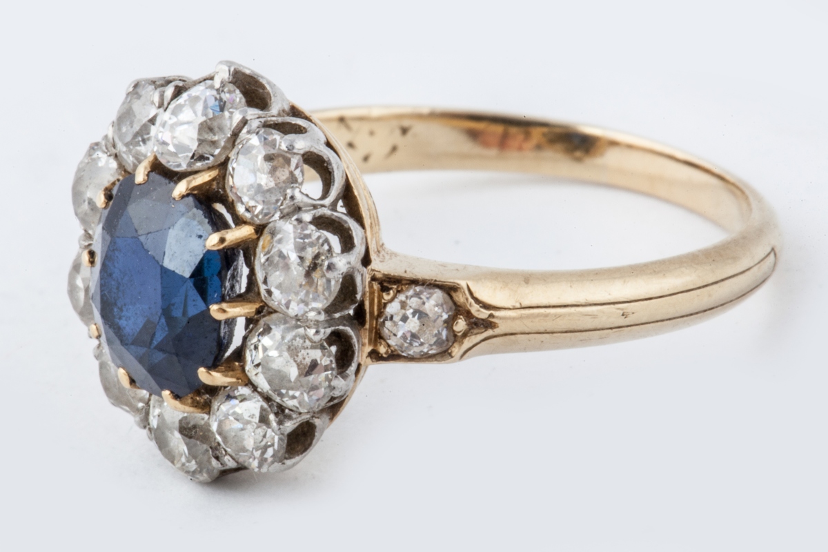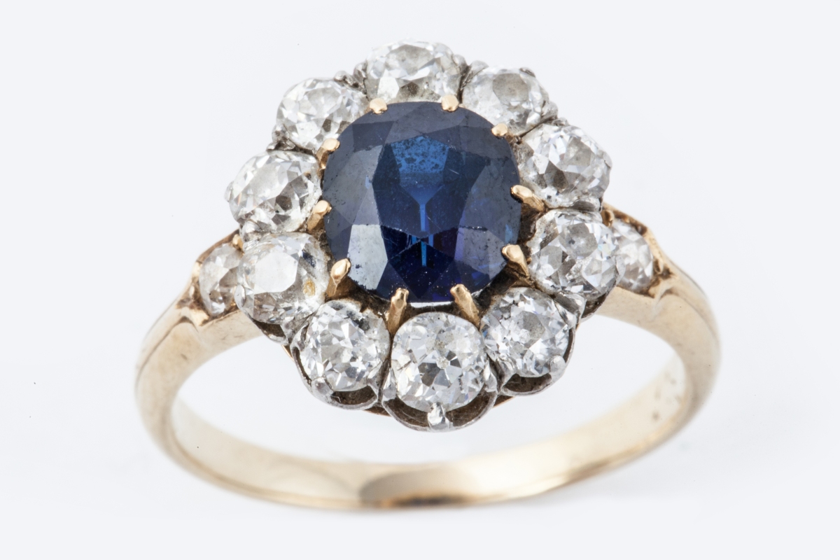 BAGUE en or jaune 18K ornée d'un SAPHIR ovale dans un entourage de douze diamants ronds de taille ancienne.
