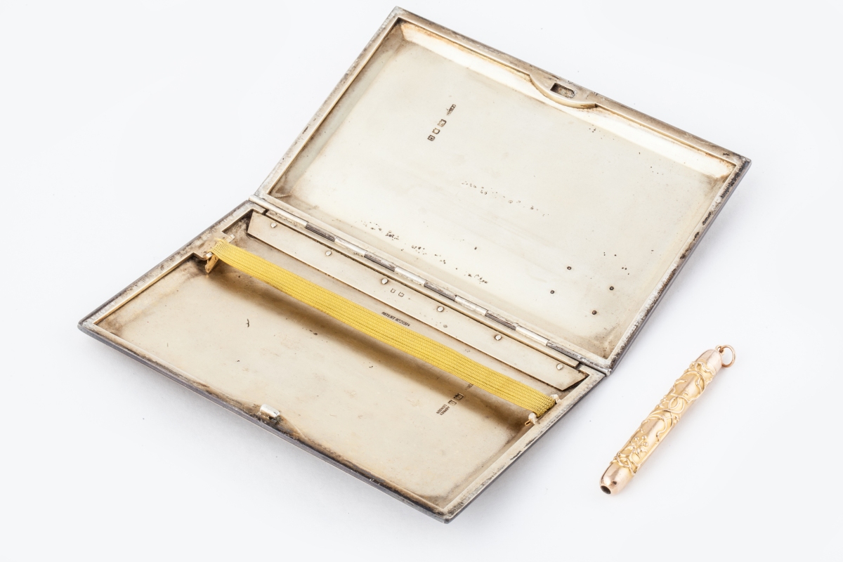 Joint : ASPREY. ÉTUI À CIGARETTE en argent guilloché et vermeil de forme rectangulaire, monogramée H.M. 13,5 x 8 cm. Poids brut 215 g.