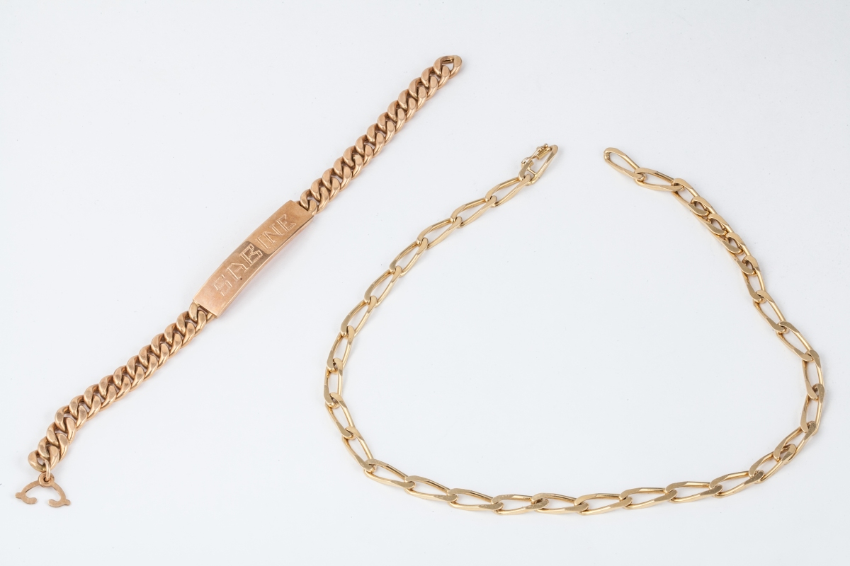 CHAÎNE et GOURMETTE en or jaune à mailles gourmettes, la gourmete marquée SABINE.