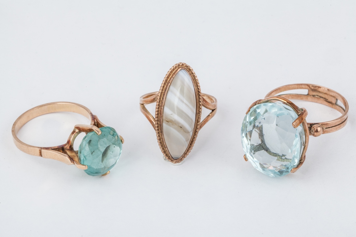 3 BAGUES en or jaune ornée de béryl (2) et d'agathe (1, brisée).