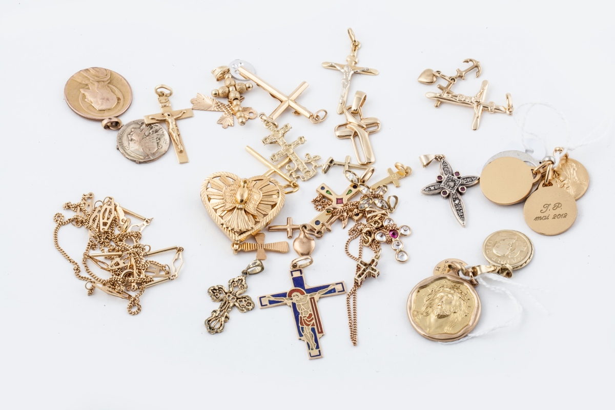 Lot de PENDENTIFS (croix, médailles, coeurs ...) en or, certains...