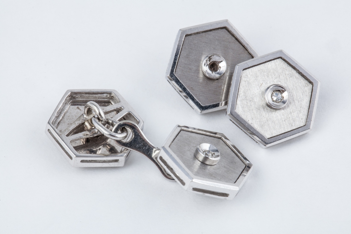 PAIRE DE BOUTONS DE MANCHETTES en or gris, de forme hexagonale, le centre serti d'un petit diamant taillé en huit-huit.