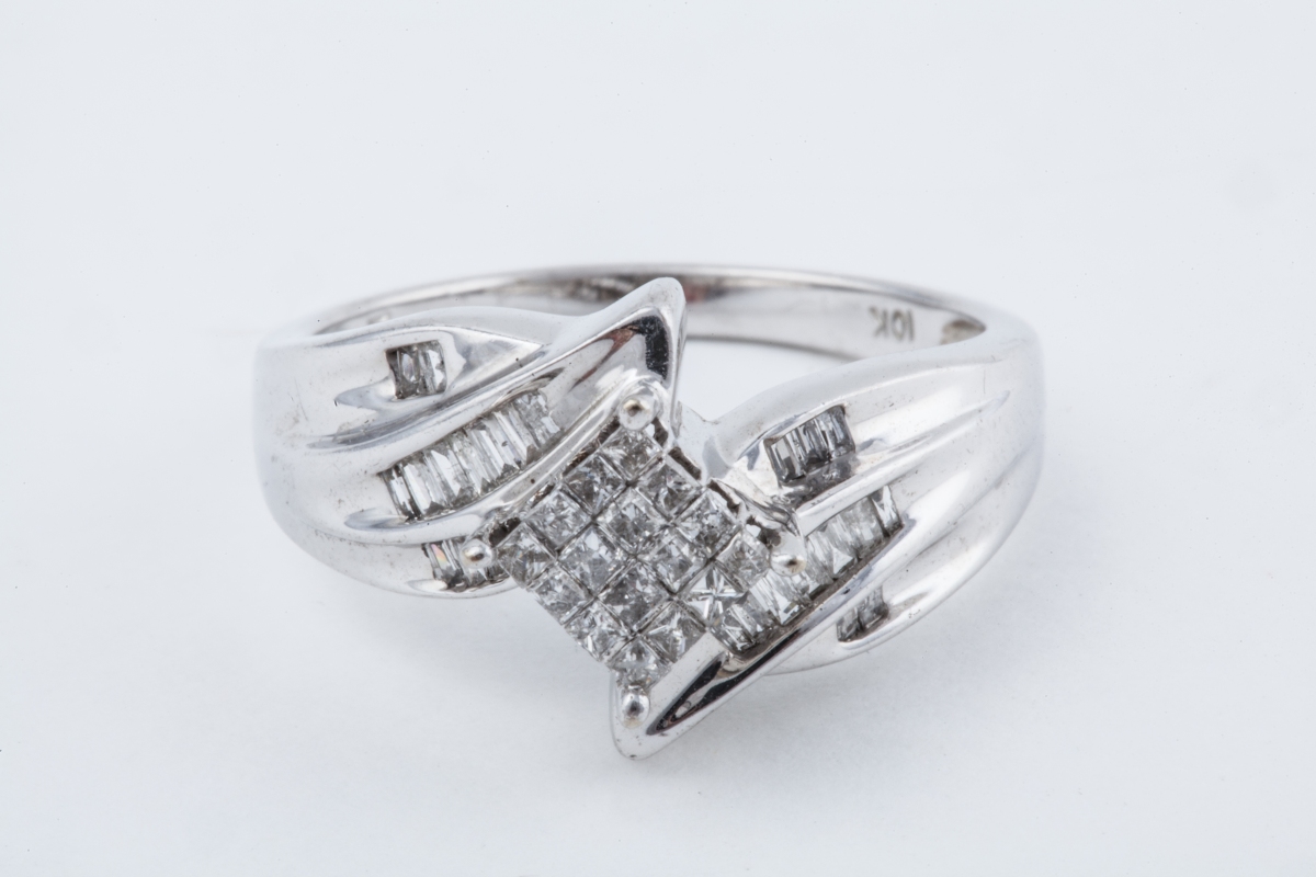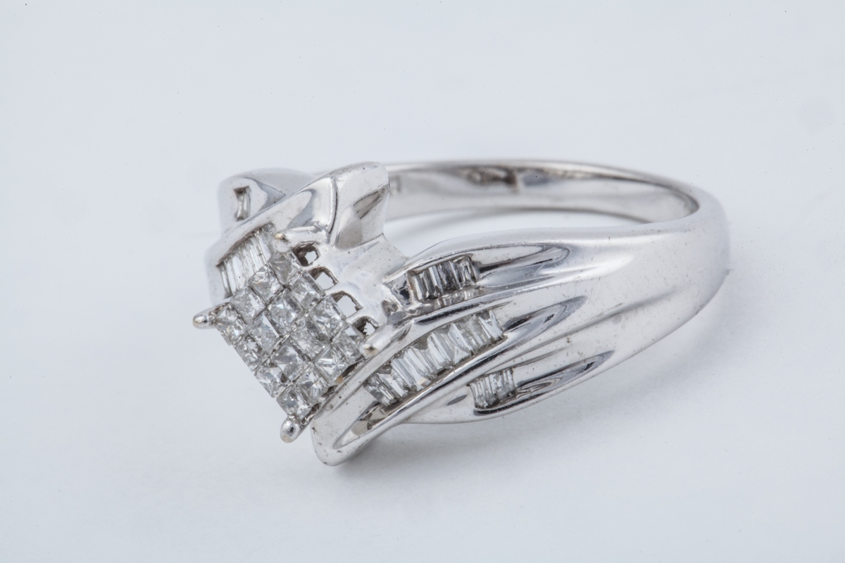 BAGUE en or gris 375 millièmes (9K), sertie de diamants rectangulaires et de forme princesse.