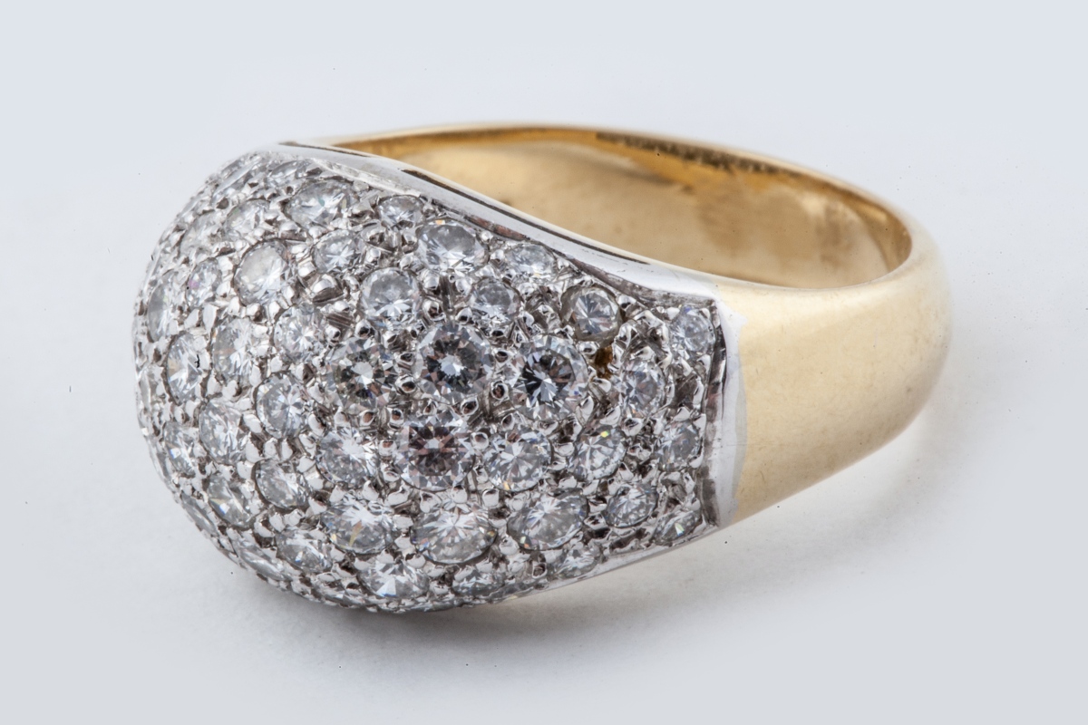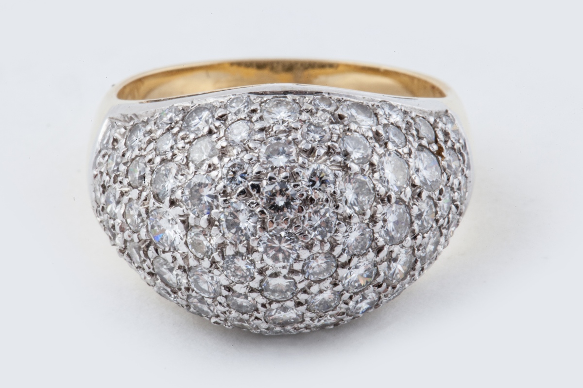 BAGUE boule en or jaune et or gris, ornée d'un pavage de diamants ronds de taille brillant.
