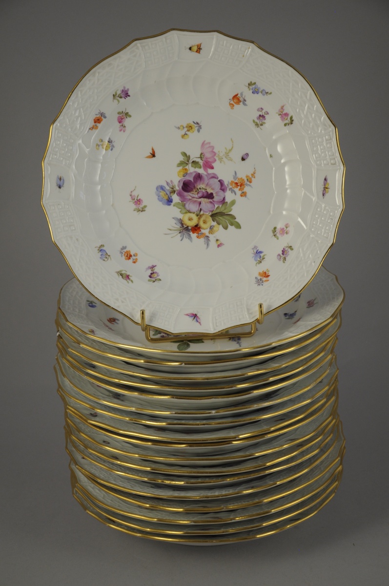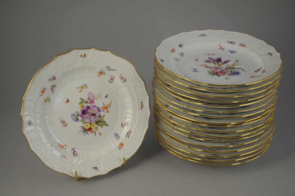 SAXE. 18 ASSIETTES CREUSES en porcelaine, marli à motif de vanneries ondées. Décor au naturel de bouquets fleuris. Bordure or.
